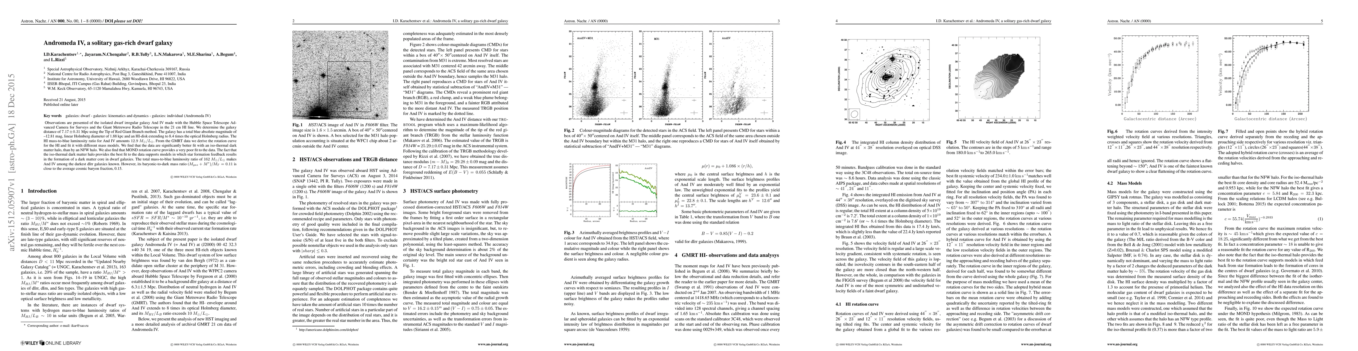 Observations are presented of the isolated dwarf irregular galaxy And IV made with the Hubble Space Telescope Advanced Camera for Surveys and the Giant Metrewave Radio Telescope in the 21 cm HI line. We determine the galaxy distance of $7.17\pm0.31$ Mpc using the Tip of Red Giant Branch method. The galaxy has a total blue absolute magnitude of -12.81 mag, linear Holmberg diameter of 1.88 kpc and an HI-disk extending to 8.4 times the optical Holmberg radius. The HI mass-to-blue luminosity ratio for And IV amounts $12.9~M_{\odot}/L_{\odot}$. From the GMRT data we derive the rotation curve for the HI and fit it with different mass models. We find that the data are significantly better fit with an iso-thermal dark matter halo, than by an NFW halo. We also find that MOND rotation curve provides a very poor fit to the data. The fact that the iso-thermal dark matter halo provides the best fit to the data supports models in which star formation feedback results in the formation of a dark matter core in dwarf galaxies. The total mass-to-blue luminosity ratio of $162~M_{\odot}/L_{\odot}$ makes And IV among the darkest dIrr galaxies known. However, its baryonic-to-dark mass ratio ($M_{gas}+M^*)/M_T = 0.11$ is close to the average cosmic baryon fraction, 0.15.