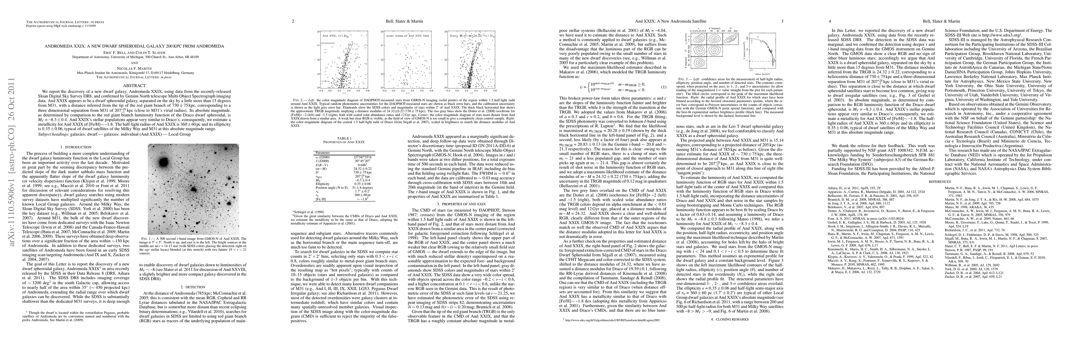 The paper reports the discovery of Andromeda XXIX, a new dwarf spheroidal galaxy located 200kpc from Andromeda (M31), with an estimated absolute magnitude of M_V = -8.3 and a metallicity similar to the Draco dwarf. The galaxy's half-light radius is 360pc, typical of other dwarf satellites.