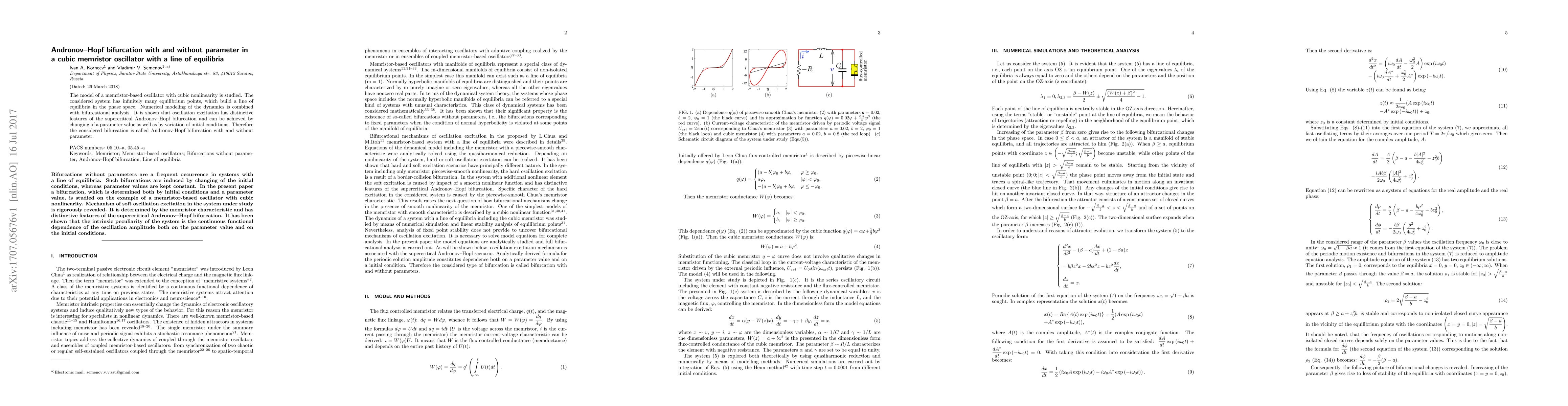 The model of a memristor-based oscillator with cubic nonlinearity is studied. The considered system has infinitely many equilibrium points, which build a line of equilibria in the phase space. Numerical modeling of the dynamics is combined with bifurcational analysis. It is shown that oscillation excitation has distinctive features of the supercritical Andronov--Hopf bifurcation and can be achieved by changing of a parameter value as well as by variation of initial conditions. Therefore the considered bifurcation is called Andronov-Hopf bifurcation with and without parameter.