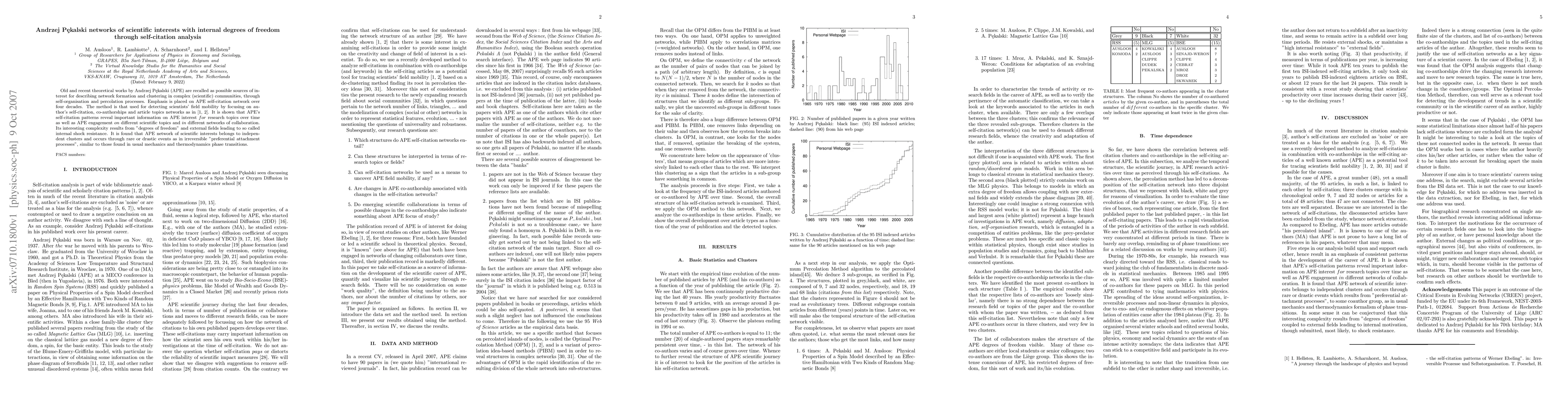 Old and recent theoretical works by Andrzej Pekalski (APE) are recalled as possible sources of interest for describing network formation and clustering in complex (scientific) communities, through self-organisation and percolation processes. Emphasis is placed on APE self-citation network over four decades. The method is that used for detecting scientists field mobility by focusing on author's self-citation, co-authorships and article topics networks as in [1,2]. It is shown that APE's self-citation patterns reveal important information on APE interest for research topics over time as well as APE engagement on different scientific topics and in different networks of collaboration. Its interesting complexity results from "degrees of freedom" and external fields leading to so called internal shock resistance. It is found that APE network of scientific interests belongs to independent clusters and occurs through rare or drastic events as in irreversible "preferential attachment processes", similar to those found in usual mechanics and thermodynamics phase transitions.