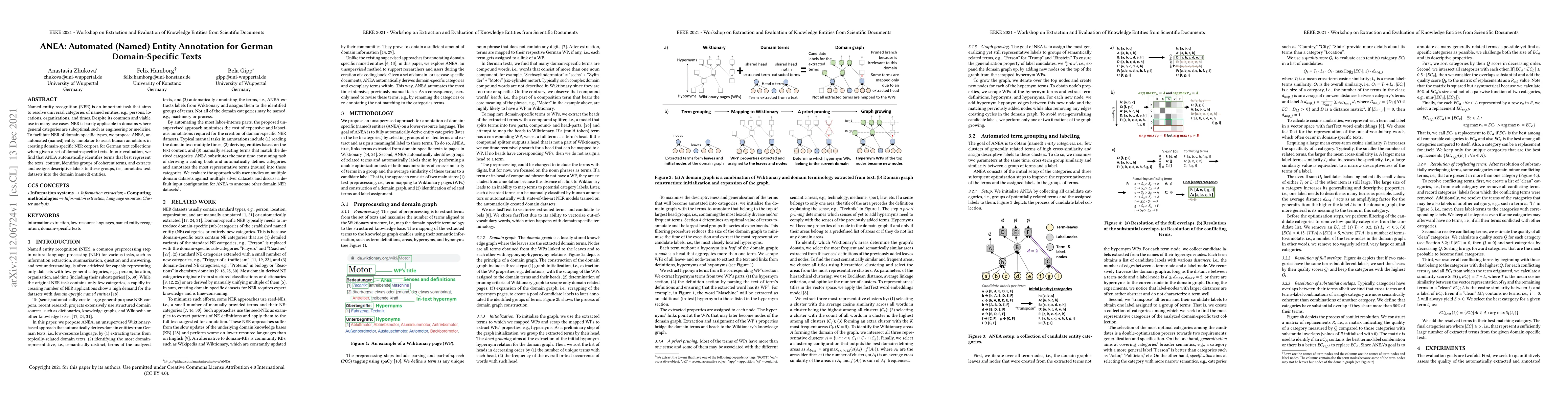 The paper introduces ANEA, an automated tool for named entity annotation tailored for domain-specific German texts, aiding human annotators in creating specialized NER corpora. Evaluations show ANEA effectively identifies and labels domain-specific terms and groups.