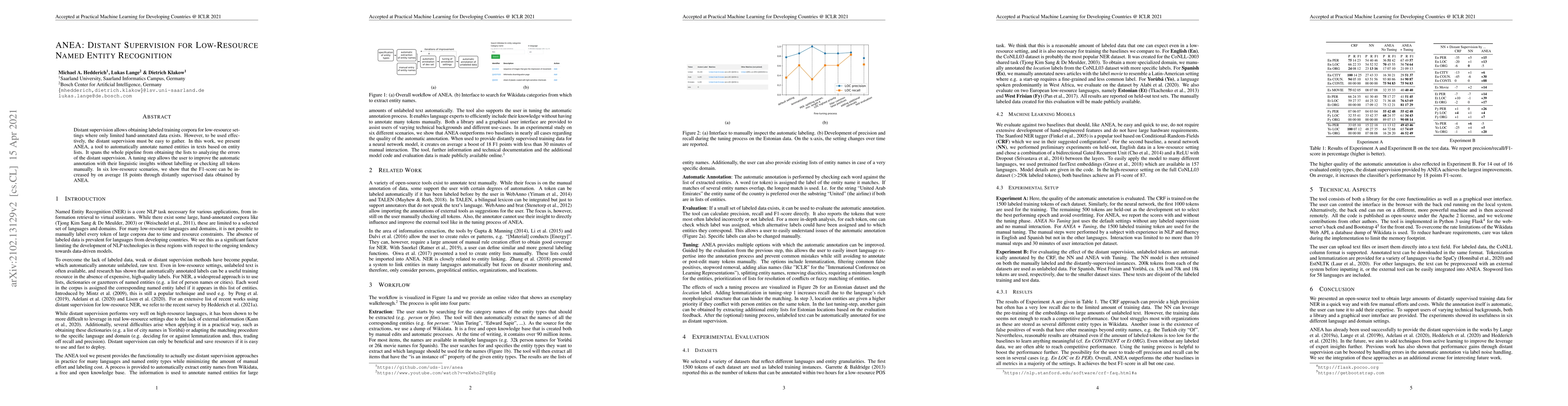 ANEA is a tool for automatically annotating named entities using distant supervision from entity lists, enhancing low-resource named entity recognition. It improves F1-scores by an average of 18 points across six scenarios through effectively collected distantly supervised data.