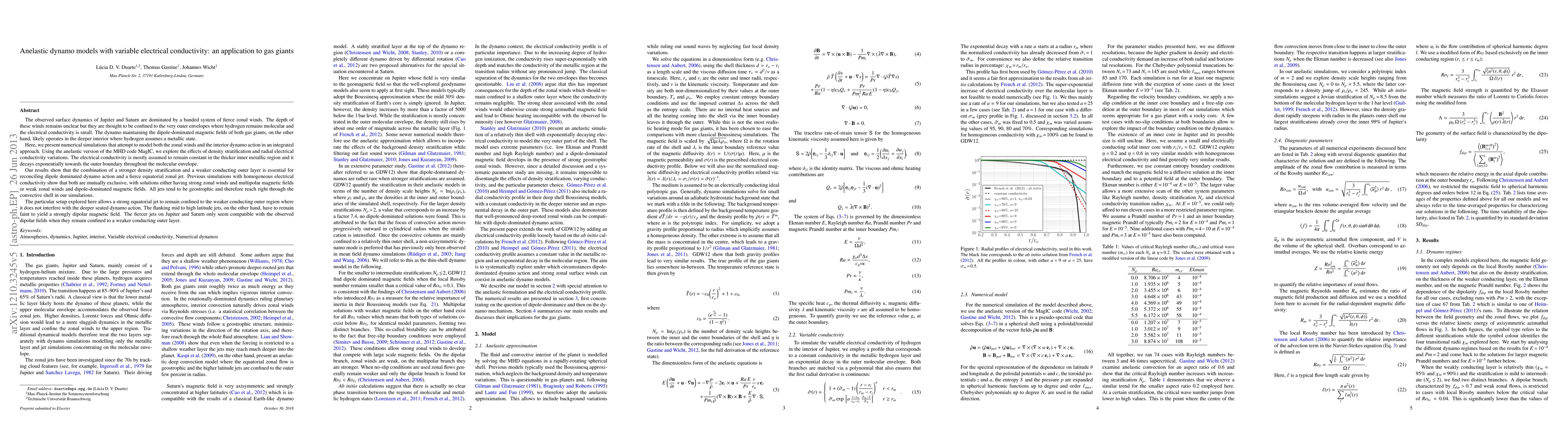 This paper presents numerical simulations using an anelastic dynamo model to explore the interplay between zonal winds and magnetic dynamo action in the interiors of gas giants like Jupiter and Saturn. The simulations reveal that stronger density stratification and a variable electrical conductivity, which decreases in the outer molecular envelope, are crucial for generating both strong equatorial jets and dipole-dominated magnetic fields.