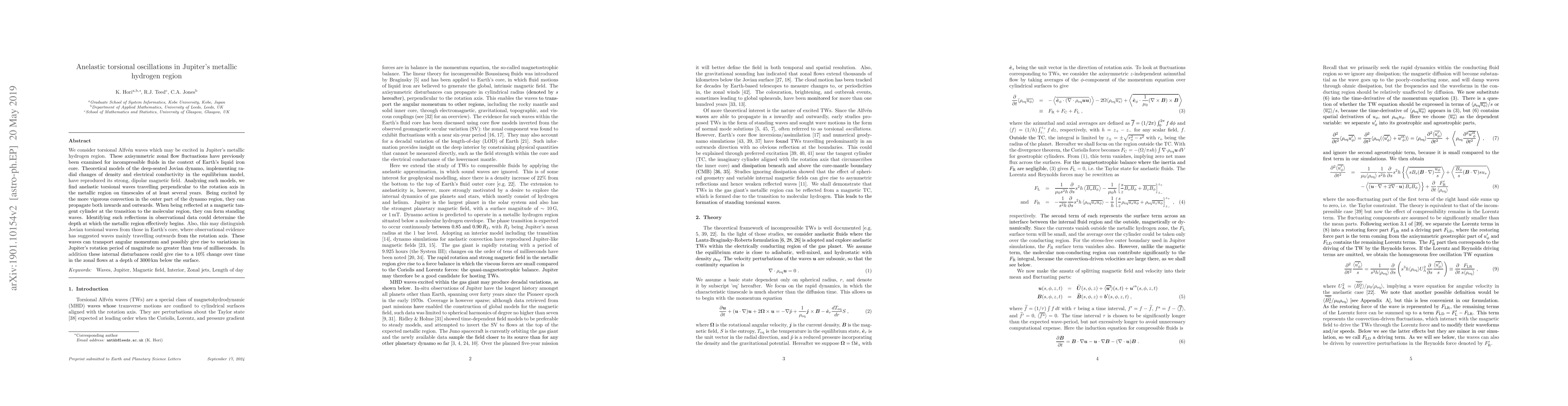This research investigates torsional Alfvén waves in Jupiter's metallic hydrogen layer, finding they travel perpendicular to the rotation axis over years, potentially reflecting at the molecular region boundary. These waves could indicate the metallic region's depth and distinguish Jovian waves from Earth's, possibly affecting Jupiter's rotation period and zonal flows.