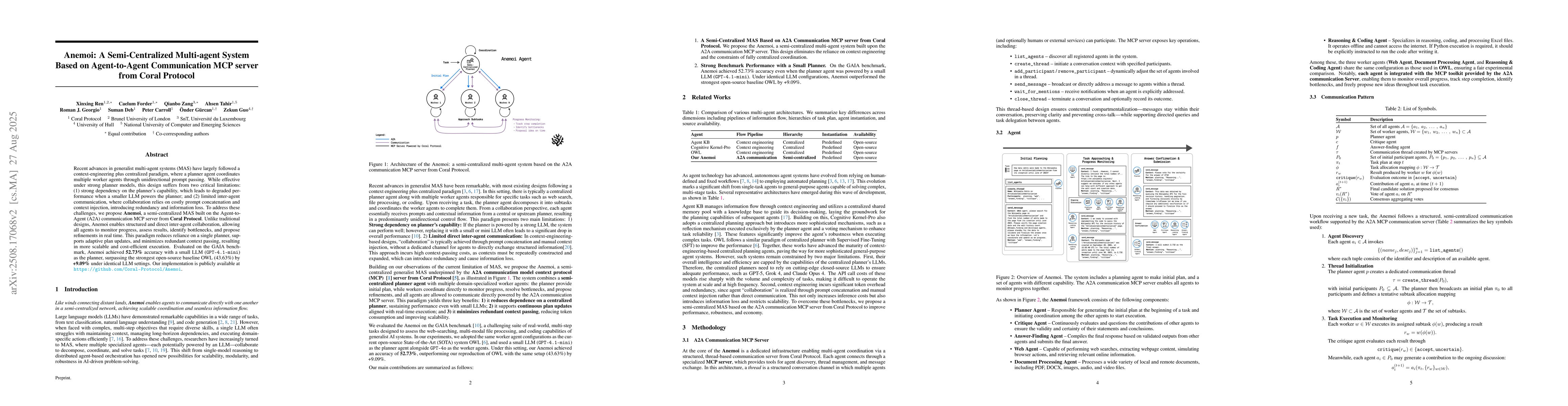 Recent advances in generalist multi-agent systems (MAS) have largely followed a context-engineering plus centralized paradigm, where a planner agent coordinates multiple worker agents through unidirectional prompt passing. While effective under strong planner models, this design suffers from two critical limitations: (1) strong dependency on the planner's capability, which leads to degraded performance when a smaller LLM powers the planner; and (2) limited inter-agent communication, where collaboration relies on costly prompt concatenation and context injection, introducing redundancy and information loss. To address these challenges, we propose Anemoi, a semi-centralized MAS built on the Agent-to-Agent (A2A) communication MCP server from Coral Protocol. Unlike traditional designs, Anemoi enables structured and direct inter-agent collaboration, allowing all agents to monitor progress, assess results, identify bottlenecks, and propose refinements in real time. This paradigm reduces reliance on a single planner, supports adaptive plan updates, and minimizes redundant context passing, resulting in more scalable and cost-efficient execution. Evaluated on the GAIA benchmark, Anemoi achieved 52.73% accuracy with a small LLM (GPT-4.1-mini) as the planner, surpassing the strongest open-source baseline OWL (43.63%) by +9.09% under identical LLM settings. Our implementation is publicly available at https://github.com/Coral-Protocol/Anemoi.