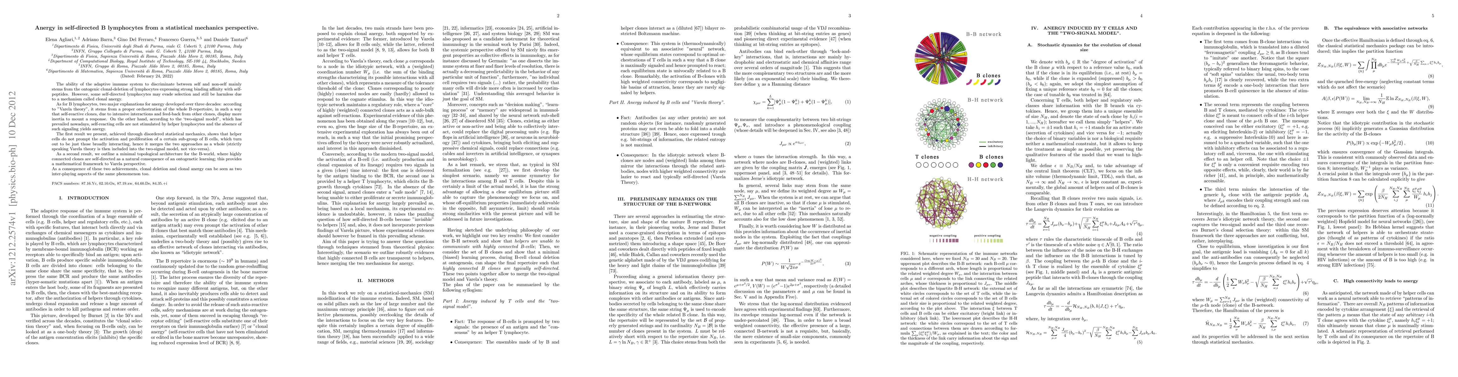 The ability of the adaptive immune system to discriminate between self and non-self mainly stems from the ontogenic clonal-deletion of lymphocytes expressing strong binding affinity with self-peptides. However, some self-directed lymphocytes may evade selection and still be harmless due to a mechanism called clonal anergy. As for B lymphocytes, two major explanations for anergy developed over three decades: according to "Varela theory", it stems from a proper orchestration of the whole B-repertoire, in such a way that self-reactive clones, due to intensive interactions and feed-back from other clones, display more inertia to mount a response. On the other hand, according to the `two-signal model", which has prevailed nowadays, self-reacting cells are not stimulated by helper lymphocytes and the absence of such signaling yields anergy. The first result we present, achieved through disordered statistical mechanics, shows that helper cells do not prompt the activation and proliferation of a certain sub-group of B cells, which turn out to be just those broadly interacting, hence it merges the two approaches as a whole (in particular, Varela theory is then contained into the two-signal model). As a second result, we outline a minimal topological architecture for the B-world, where highly connected clones are self-directed as a natural consequence of an ontogenetic learning; this provides a mathematical framework to Varela perspective. As a consequence of these two achievements, clonal deletion and clonal anergy can be seen as two inter-playing aspects of the same phenomenon too.