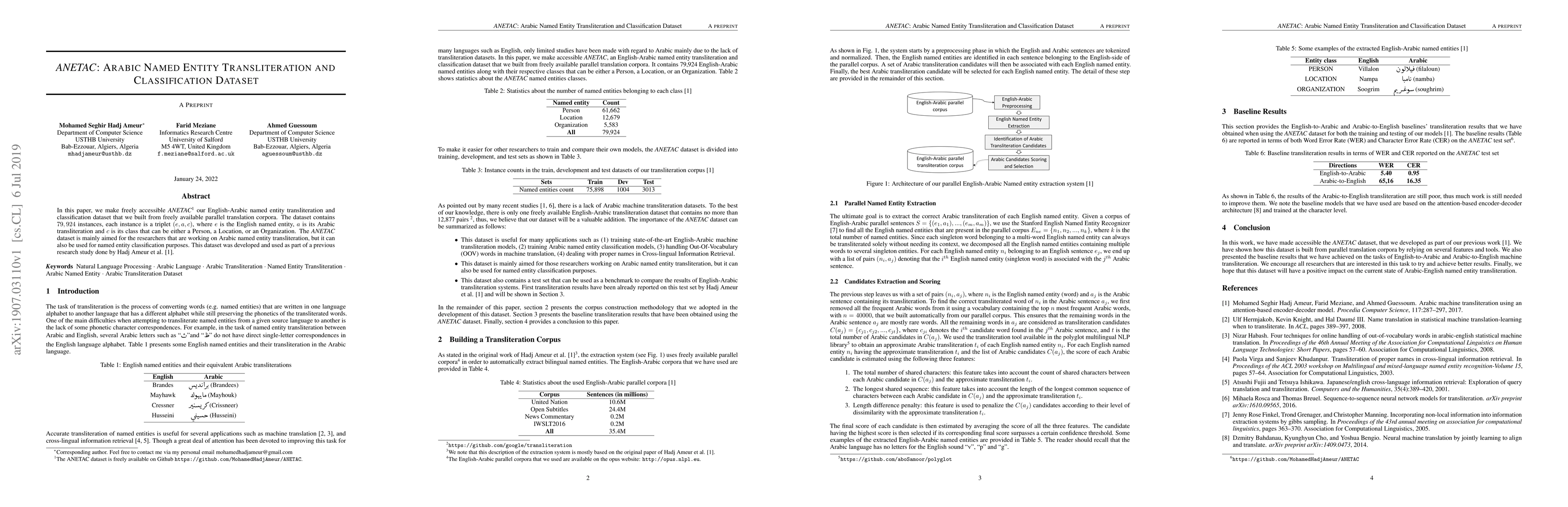 This paper presents ANETAC, a freely accessible English-Arabic named entity transliteration and classification dataset comprising 79,924 triplets. It is intended to support research in Arabic named entity transliteration and classification.