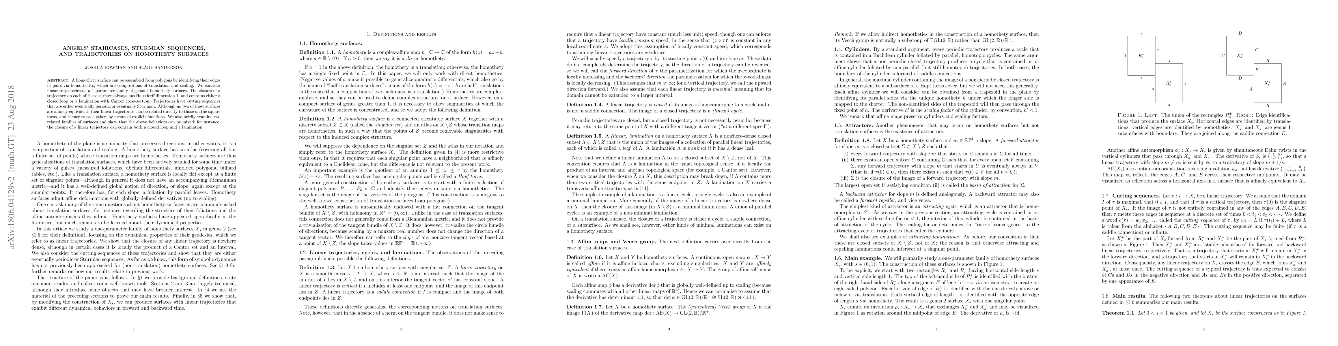 This paper explores linear trajectories on a family of genus-2 homothety surfaces, revealing that their closures always have Hausdorff dimension 1, containing either a closed loop or a lamination with Cantor cross-section. The trajectories exhibit cutting sequences that are either eventually periodic or eventually Sturmian.