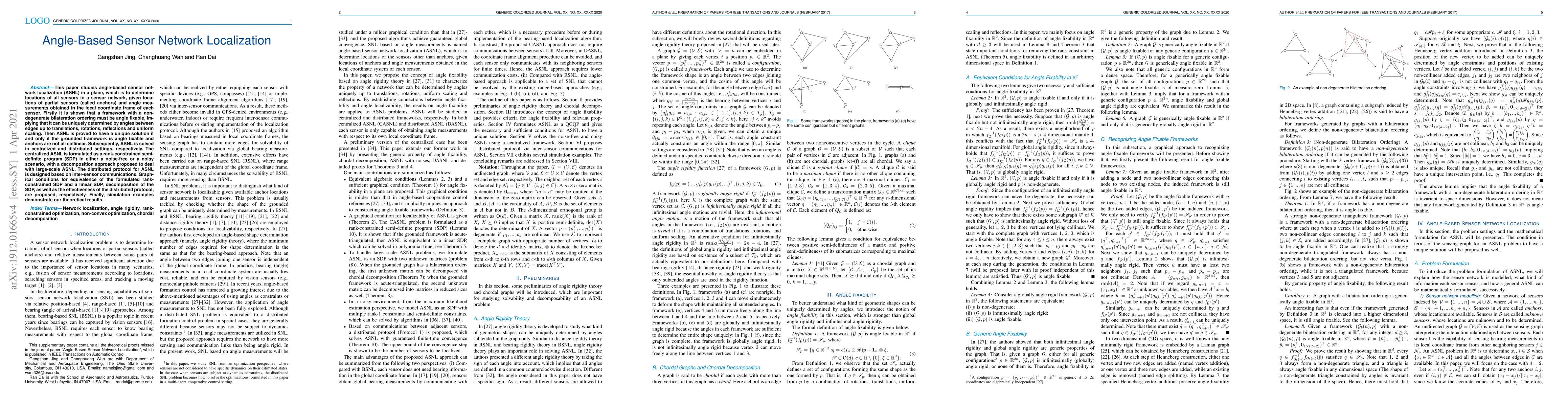 This paper proposes a framework for angle-based sensor network localization that can uniquely determine sensor locations given partial sensor data and angle measurements. It presents centralized and distributed solutions to the problem, with theoretical results supported by simulation examples.