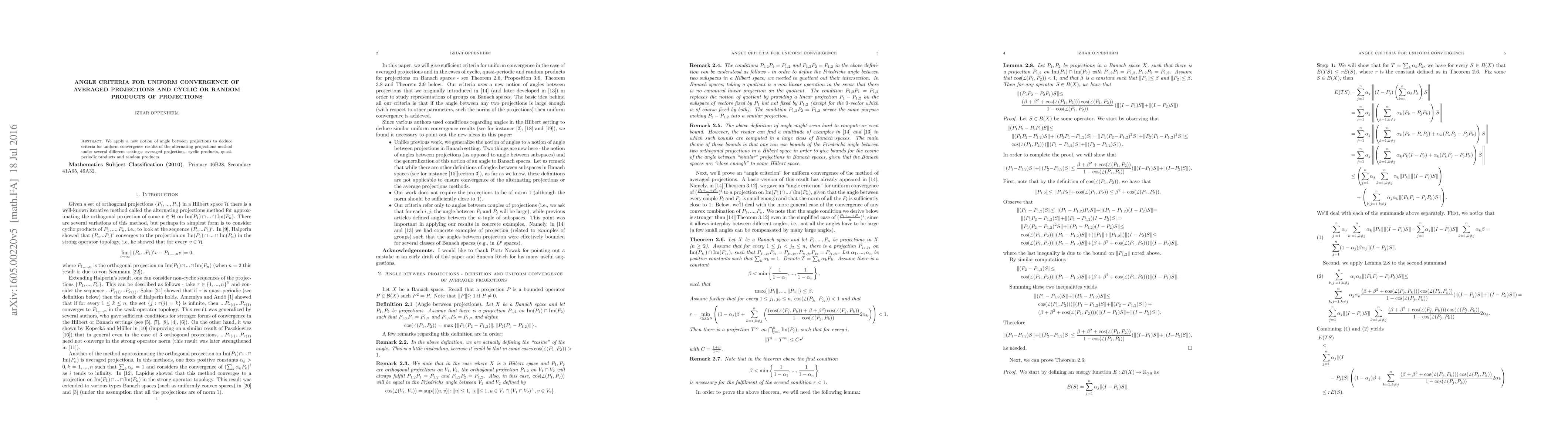 Summary: This paper introduces a new angle criterion for projections to establish uniform convergence for various projection methods, including averaged, cyclic, quasi-periodic, and random products. The results provide insights into the effectiveness of these projection techniques.