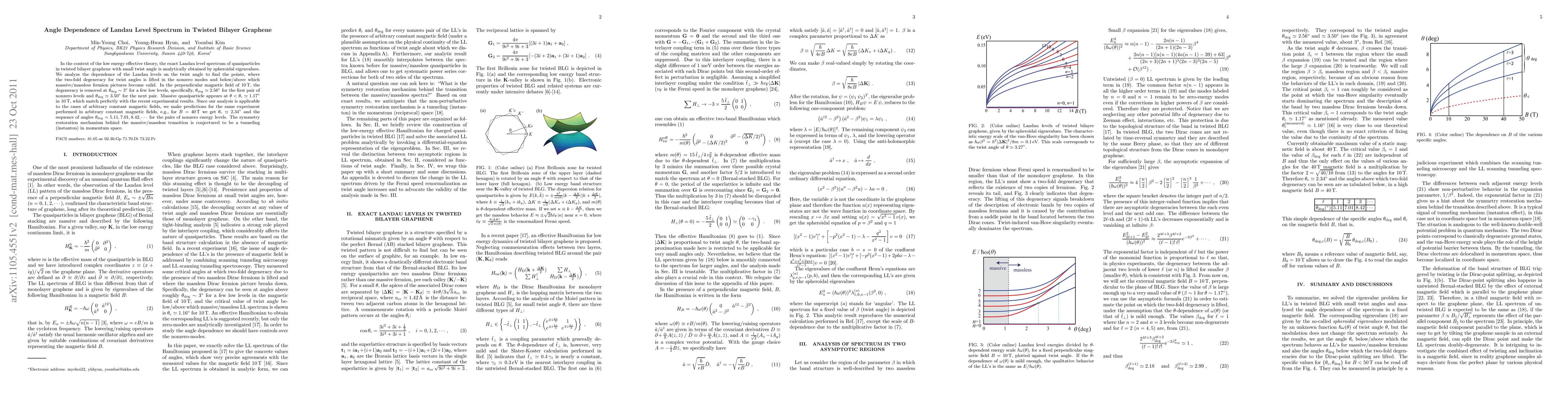 In the context of the low energy effective theory, the exact Landau level spectrum of quasiparticles in twisted bilayer graphene with small twist angle is analytically obtained by spheroidal eigenvalues. We analyze the dependence of the Landau levels on the twist angle to find the points, where the two-fold degeneracy for twist angles is lifted in the nonzero modes and below/above which massive/massless fermion pictures become valid. In the perpendicular magnetic field of 10\,T, the degeneracy is removed at $\theta_{{\rm deg}}\sim 3^\circ$ %angles around 3 degrees for a few low levels, specifically, $\theta_{\rm deg}\simeq 2.56^\circ$ for the first pair of nonzero levels and $\theta_{\rm deg}\simeq 3.50^\circ$ for the next pair. Massive quasiparticle appears at $\theta<\theta_{{\rm c}}\simeq 1.17^\circ$ in 10\,T, %angles less than 1.17 degrees. which match perfectly with the recent experimental results. Since our analysis is applicable to the cases of arbitrary constant magnetic fields, we make predictions for the same experiment performed in arbitrary constant magnetic fields, e.g., for B=40\,T we get $\theta_{\rm c}\simeq 2.34^\circ$ and the sequence of angles $\theta_{\rm deg} = 5.11, 7.01, 8.42,...$ for the pairs of nonzero energy levels. The symmetry restoration mechanism behind the massive/massless transition is conjectured to be a tunneling (instanton) in momentum space.