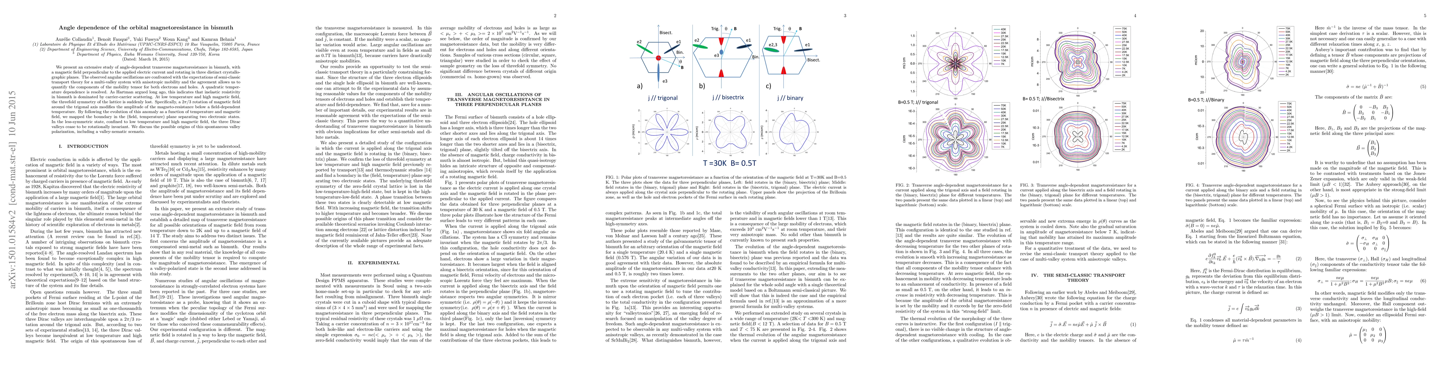 We present an extensive study of angle-dependent transverse magnetoresistance in bismuth, with a magnetic field perpendicular to the applied electric current and rotating in three distinct crystallographic planes. The observed angular oscillations are confronted with the expectations of semi-classic transport theory for a multi-valley system with anisotropic mobility and the agreement allows us to quantify the components of the mobility tensor for both electrons and holes. A quadratic temperature dependence is resolved. As Hartman argued long ago, this indicates that inelastic resistivity in bismuth is dominated by carrier-carrier scattering. At low temperature and high magnetic field, the threefold symmetry of the lattice is suddenly lost. Specifically, a $2\pi/3$ rotation of magnetic field around the trigonal axis modifies the amplitude of the magneto-resistance below a field-dependent temperature. By following the evolution of this anomaly as a function of temperature and magnetic field, we mapped the boundary in the (field, temperature) plane separating two electronic states. In the less-symmetric state, confined to low temperature and high magnetic field, the three Dirac valleys cease to be rotationally invariant. We discuss the possible origins of this spontaneous valley polarization, including a valley-nematic scenario.