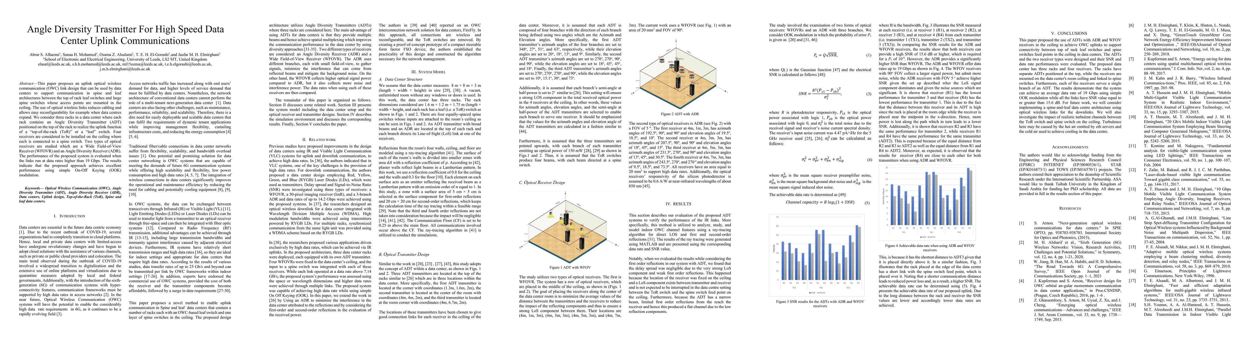 This paper proposes an Angle Diversity Transmitter (ADT) for high-speed optical wireless communication links in data centers, enabling flexible spine and leaf architecture connections. The system achieves excellent performance at data rates exceeding 19 Gbps using simple On-Off Keying (OOK).