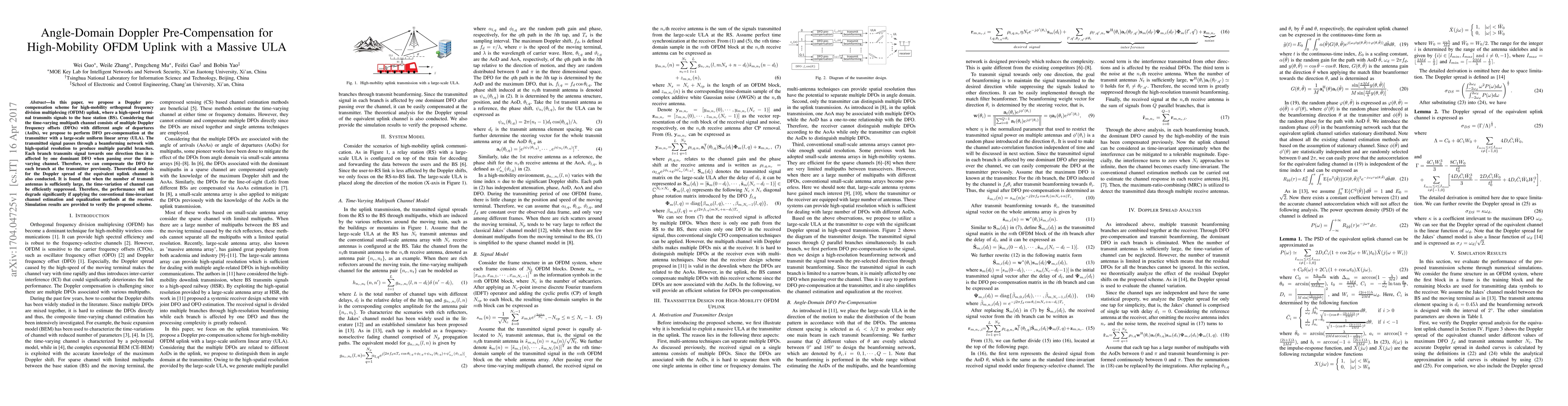 In this paper, we propose a Doppler pre-compensation scheme for high-mobility orthogonal frequency division multiplexing (OFDM) uplink, where a high-speed terminal transmits signals to the base station (BS). Considering that the time-varying multipath channel consists of multiple Doppler frequency offsets (DFOs) with different angle of departures (AoDs), we propose to perform DFO pre-compensation at the transmitter with a large-scale uniform linear array (ULA). The transmitted signal passes through a beamforming network with high-spatial resolution to produce multiple parallel branches. Each branch transmits signal towards one direction thus it is affected by one dominant DFO when passing over the time-varying channel. Therefore, we can compensate the DFO for each branch at the transmitter previously. Theoretical analysis for the Doppler spread of the equivalent uplink channel is also conducted. It is found that when the number of transmit antennas is sufficiently large, the time-variation of channel can be efficiently suppressed. Therefore, the performance will not degrade significantly if applying the conventional time-invariant channel estimation and equalization methods at the receiver. Simulation results are provided to verify the proposed scheme.