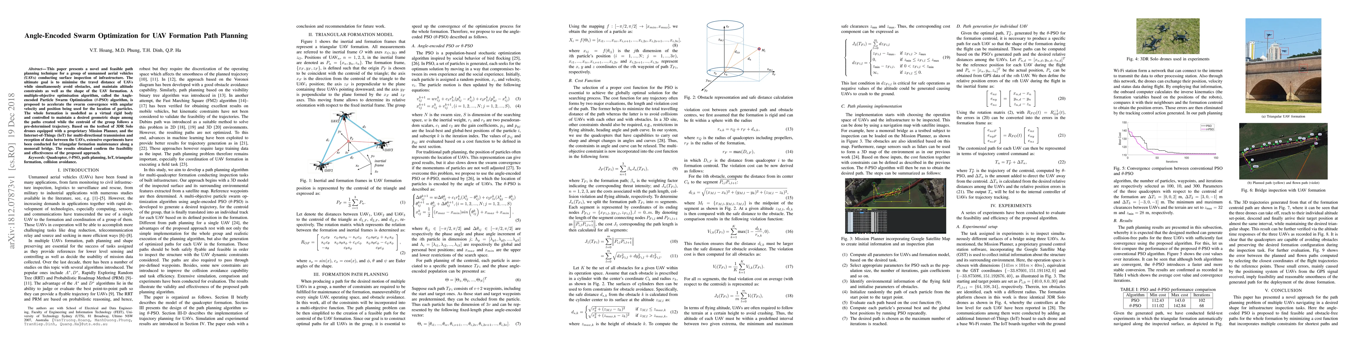 This paper introduces an Angle-encoded Particle Swarm Optimization (theta-PSO) algorithm for UAV formation path planning to minimize travel distance while avoiding obstacles and maintaining formation shape. Experiments with 3DR Solo drones confirm the approach's effectiveness in triangular formation maintenance over a monorail bridge.
