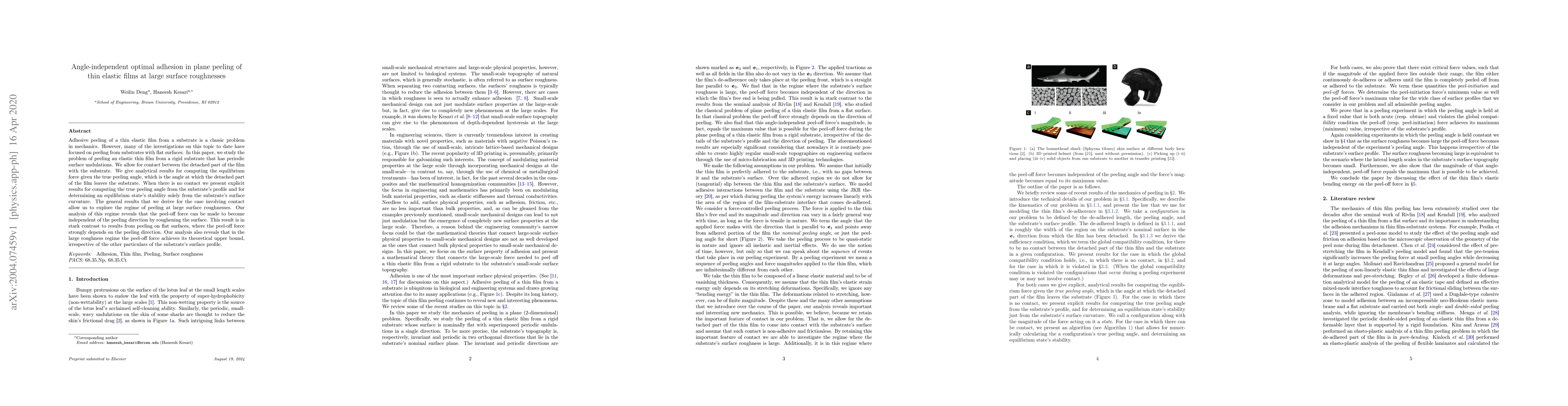 This paper studies the peeling of elastic films from rough substrates, revealing that increasing surface roughness can make the peel-off force angle-independent. Analytical results show how to compute equilibrium forces and peeling angles, and demonstrate that large surface roughness can optimize adhesion by achieving the theoretical upper bound of peel-off force regardless of the peeling direction.