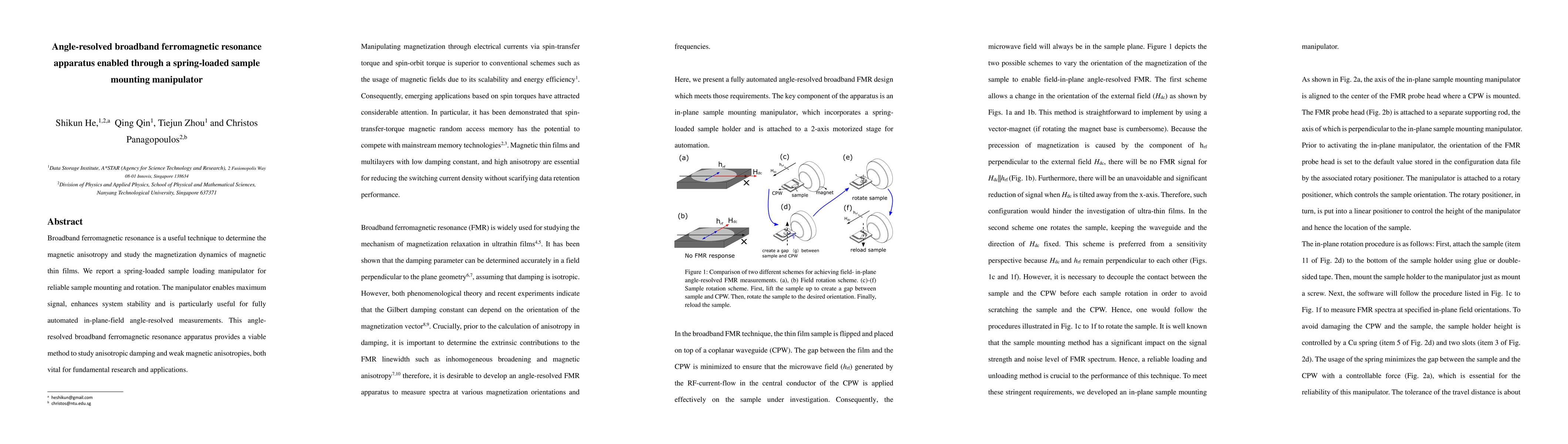 This paper introduces a spring-loaded sample mounting manipulator for angle-resolved broadband ferromagnetic resonance, enhancing system stability and signal quality. The apparatus facilitates fully automated in-plane-field measurements, aiding in the study of magnetic anisotropy and magnetization dynamics in thin films.