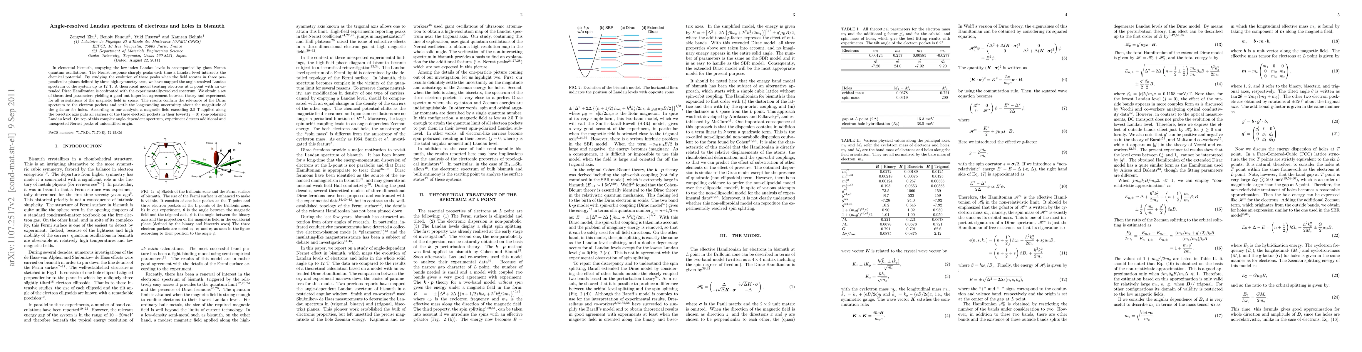In elemental bismuth, emptying the low-index Landau levels is accompanied by giant Nernst quantum oscillations. The Nernst response sharply peaks each time a Landau level intersects the chemical potential. By studying the evolution of these peaks when the field rotates in three perpendicular planes defined by three high-symmetry axes, we have mapped the angle-resolved Landau spectrum of the system up to 12 T. A theoretical model treating electrons at L point with an extended Dirac Hamiltonian is confronted with the experimentally-resolved spectrum. We obtain a set of theoretical parameters yielding a good but imperfect agreement between theory and experiment for all orientations of the magnetic field in space. The results confirm the relevance of the Dirac spectrum to the electron pockets and settle the longstanding uncertainty about the magnitude of the g-factor for holes. According to our analysis, a magnetic field exceeding 2.5 T applied along the bisectrix axis puts all carriers of the three electron pockets in their lowest($j=0$) spin-polarized Landau level. On top of this complex angle-dependent spectrum, experiment detects additional and unexpected Nernst peaks of unidentified origin.