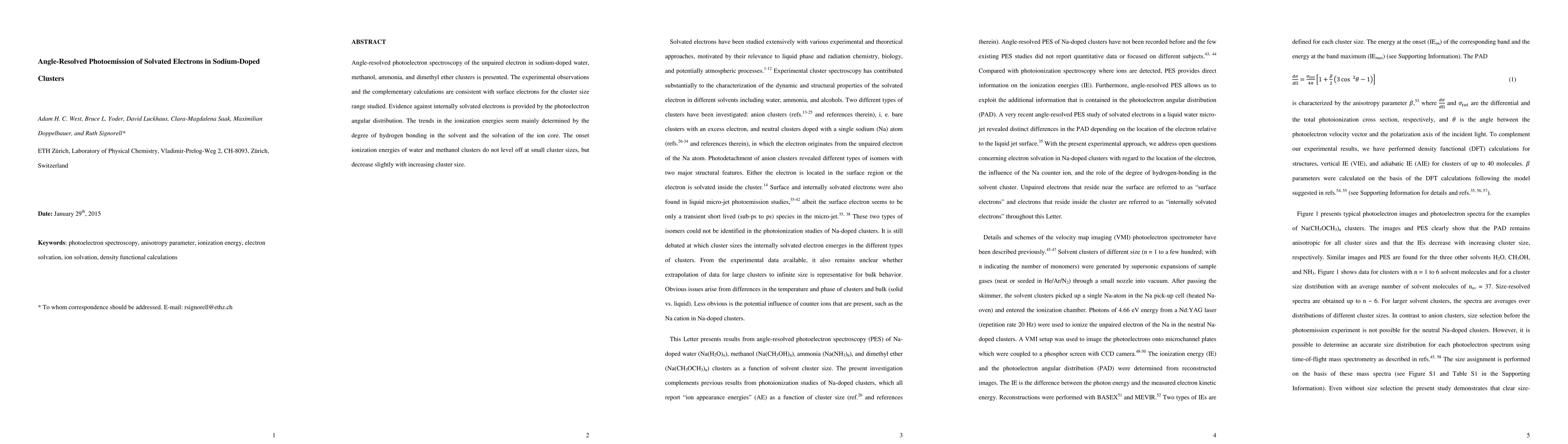 This study uses angle-resolved photoemission spectroscopy to investigate solvated electrons in sodium-doped clusters of water, methanol, ammonia, and dimethyl ether, finding surface-localized electrons rather than internally solvated ones. The ionization energy trends are primarily influenced by hydrogen bonding and ion core solvation, with water and methanol clusters showing a slight decrease in ionization energy with increasing cluster size.