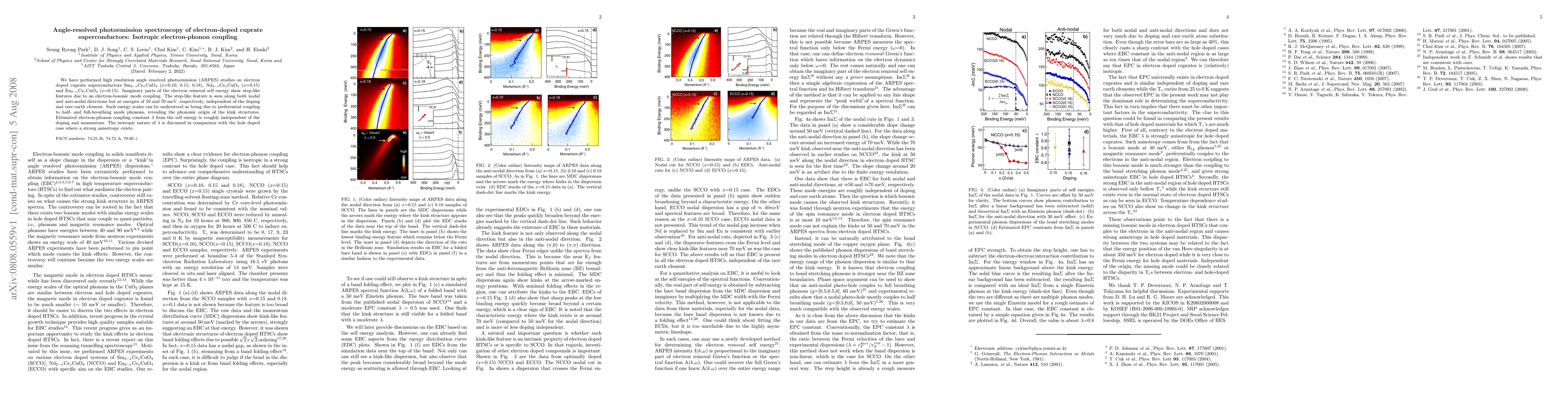High resolution angle-resolved photoemission spectroscopy reveals isotropic electron-phonon coupling in electron-doped cuprate superconductors, with consistent phononic coupling at 50 and 70 meV across different materials, contrasting with the anisotropic coupling found in hole-doped counterparts.