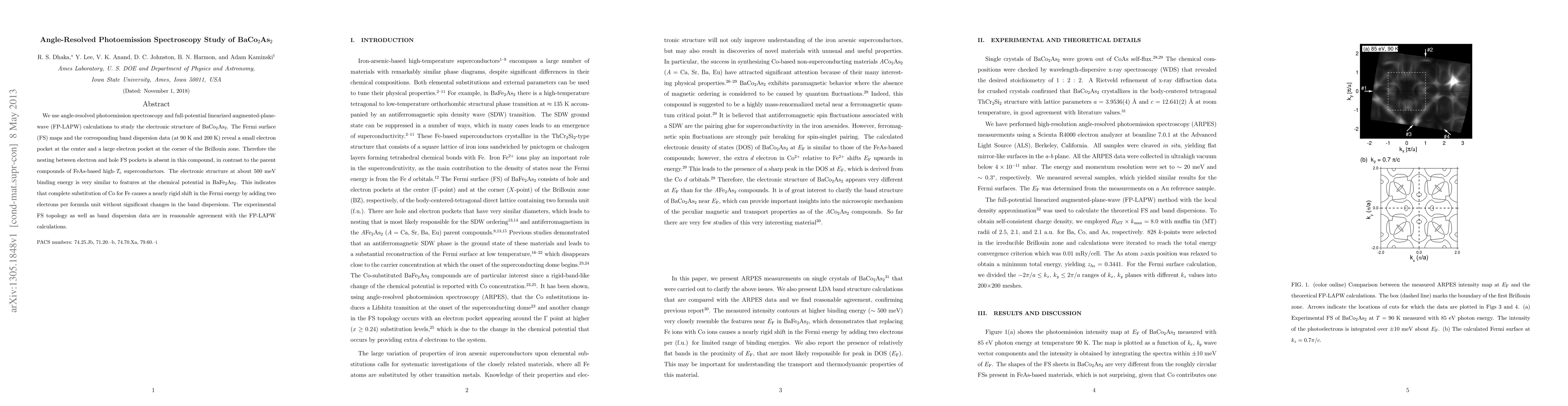 This study uses angle-resolved photoemission spectroscopy and FP-LAPW calculations to analyze BaCo2As2's electronic structure, revealing distinct electron pockets and no nesting, unlike FeAs-based superconductors. Substitution of Co for Fe results in a rigid shift in Fermi energy without significant band dispersion changes.
