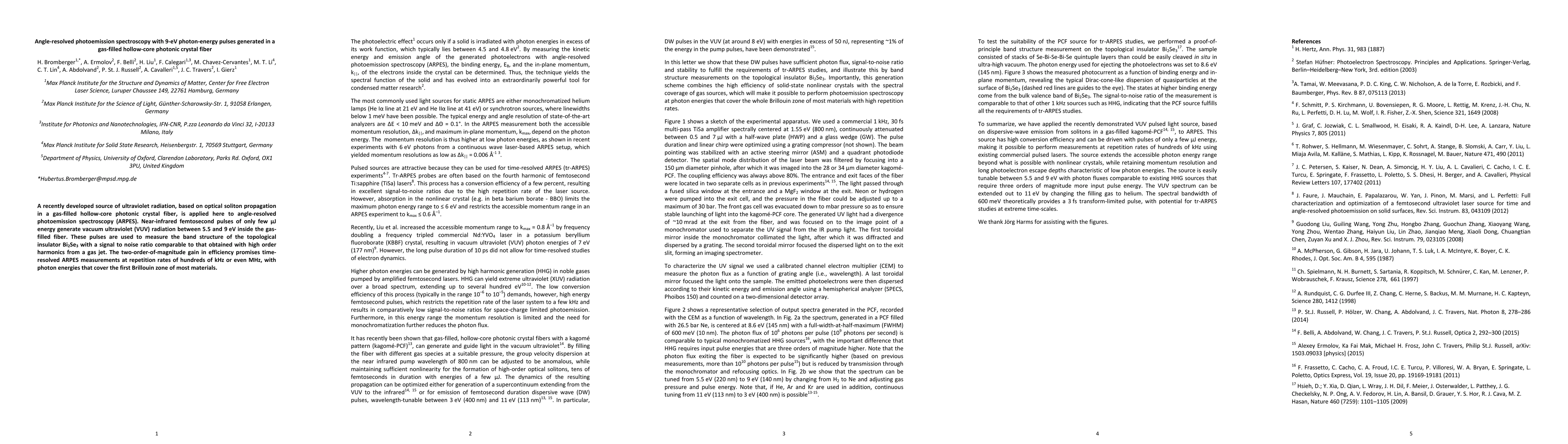 This paper demonstrates the use of a gas-filled hollow-core photonic crystal fiber to generate 9-eV ultraviolet pulses for angle-resolved photoemission spectroscopy (ARPES). The method provides a significant efficiency gain, enabling high-repetition-rate time-resolved ARPES measurements for studying the band structure of topological insulators like Bi2Se3.