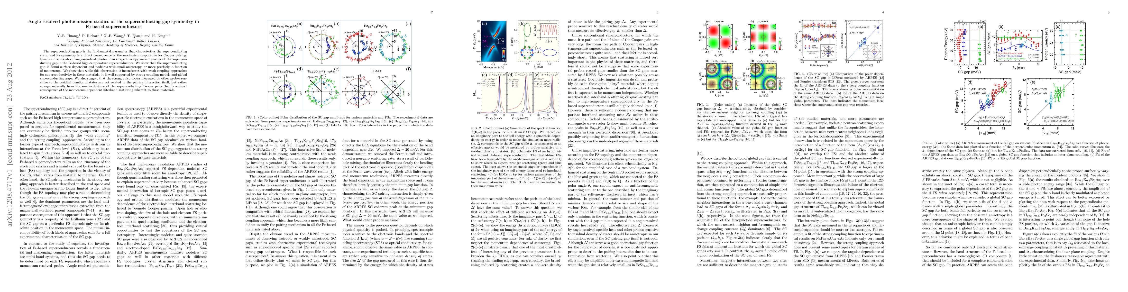 This research uses angle-resolved photoemission spectroscopy to study the superconducting gap in Fe-based high-temperature superconductors. It finds that the gap is Fermi surface dependent, nodeless with small anisotropy, and supported by strong coupling models. The study suggests that strong anisotropies measured by other probes are due to shorter Cooper pair lifetimes, not the pairing interaction itself.