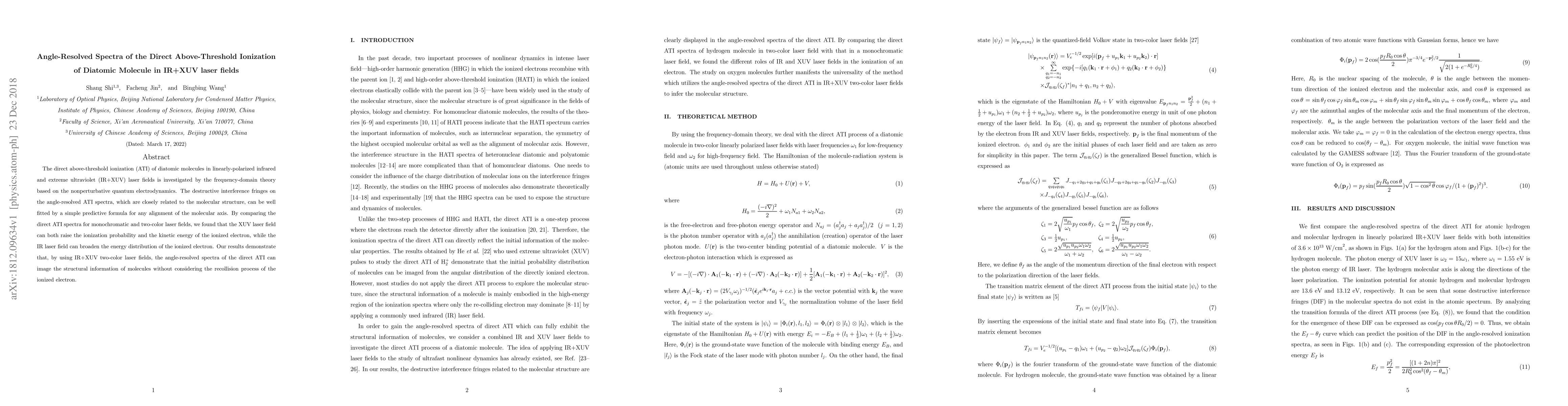 This paper investigates the direct above-threshold ionization (ATI) of diatomic molecules in IR+XUV laser fields using nonperturbative quantum electrodynamics, revealing that the XUV field enhances ionization and electron kinetic energy, while the IR field broadens electron energy distribution. The study shows that IR+XUV fields can image molecular structure through angle-resolved ATI spectra without recollision effects.