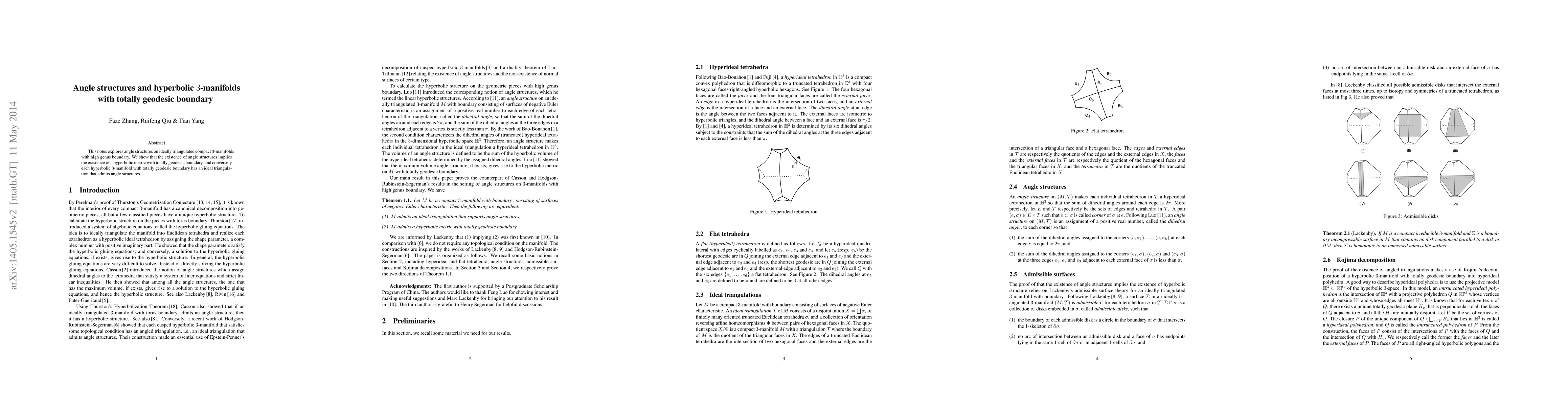 This paper investigates angle structures on compact 3-manifolds with high genus boundary, demonstrating their equivalence to hyperbolic metrics with totally geodesic boundary, and shows each such hyperbolic 3-manifold admits an ideal triangulation permitting angle structures.