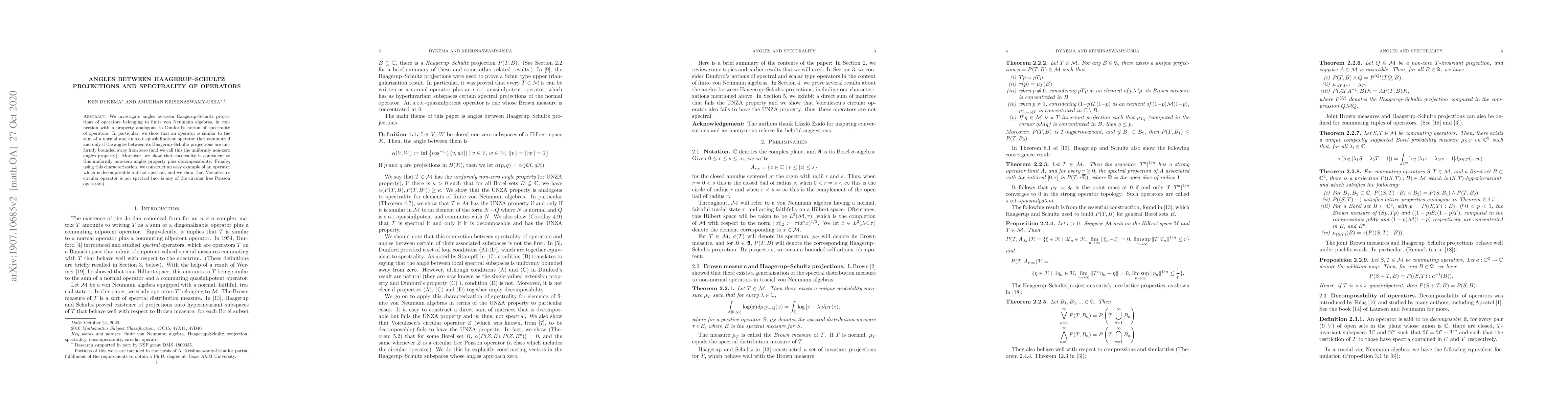 The paper investigates angles between Haagerup-Schultz projections of operators in finite von Neumann algebras, finding a connection to spectrality and decomposability, with implications for understanding spectral properties.