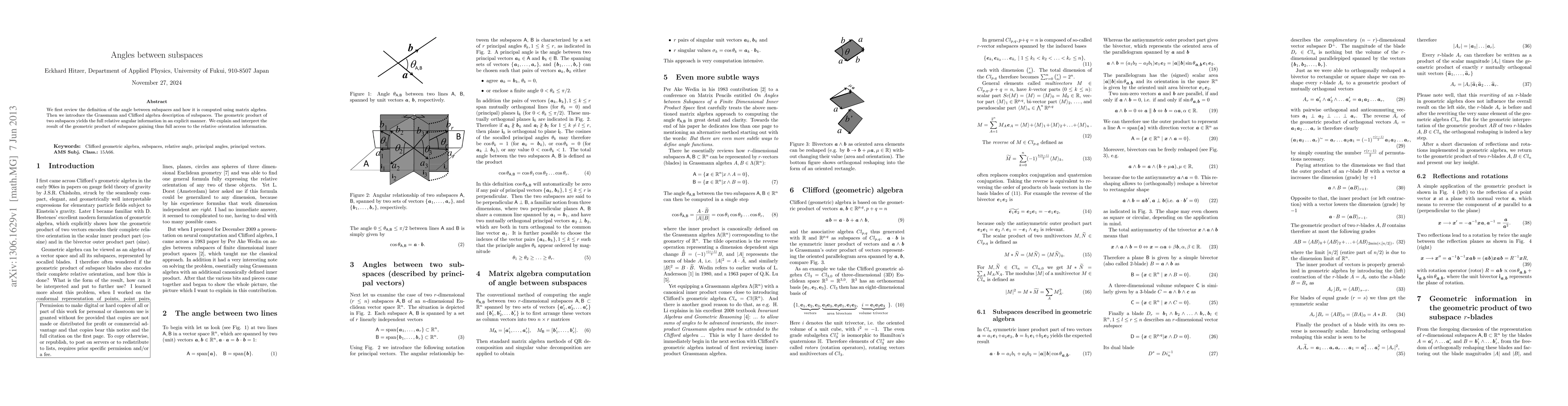 We first review the definition of the angle between subspaces and how it is computed using matrix algebra. Then we introduce the Grassmann and Clifford algebra description of subspaces. The geometric product of two subspaces yields the full relative angular information in an explicit manner. We explain and interpret the result of the geometric product of subspaces gaining thus full access to the relative orientation information.