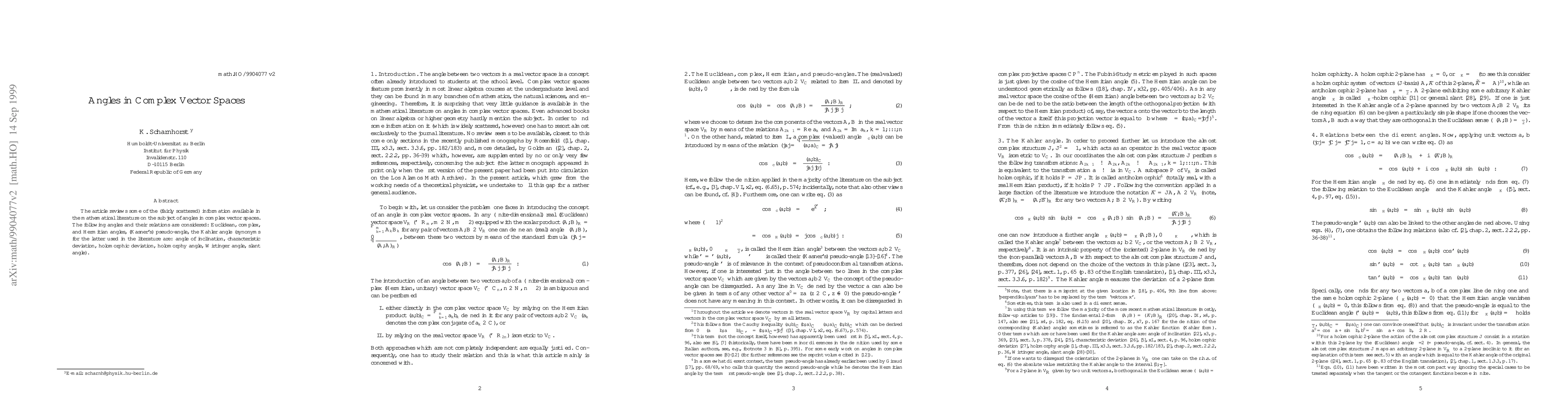 The paper reviews various angles in complex vector spaces, including Euclidean, complex, Hermitian, and pseudo-angles, highlighting their relations and implications for understanding complex geometries.