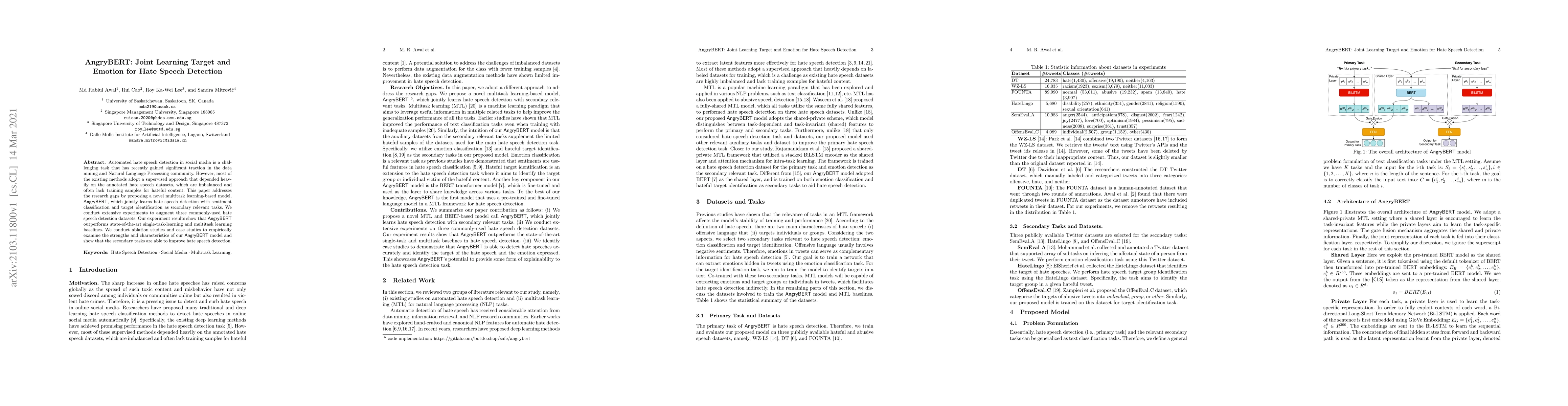 Title: AngryBERT: Joint Learning Target and Emotion for Hate Speech Detection Summary: This paper introduces AngryBERT, a multitask learning model for hate speech detection that leverages sentiment classification and target identification to improve detection accuracy. Experiments demonstrate superior performance over existing methods.