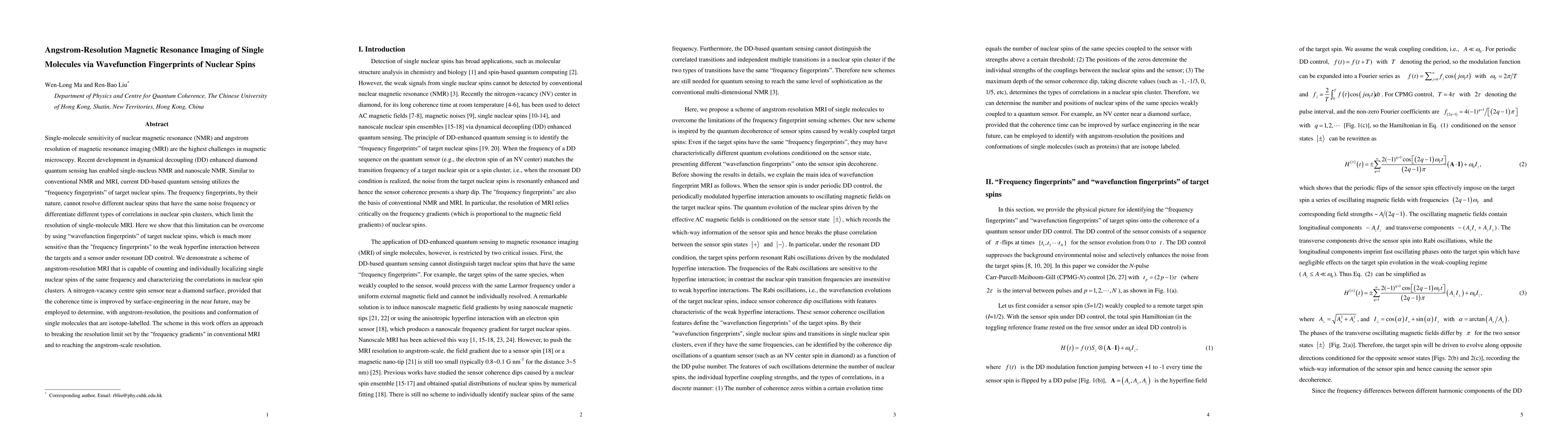 This paper presents a novel method for achieving angstrom-resolution magnetic resonance imaging (MRI) by using wavefunction fingerprints of nuclear spins instead of frequency fingerprints, overcoming limitations in current single-molecule MRI techniques. The proposed scheme employs DD-enhanced diamond quantum sensing to detect and localize individual nuclear spins, potentially enabling the determination of single-molecule positions and conformations with high precision.