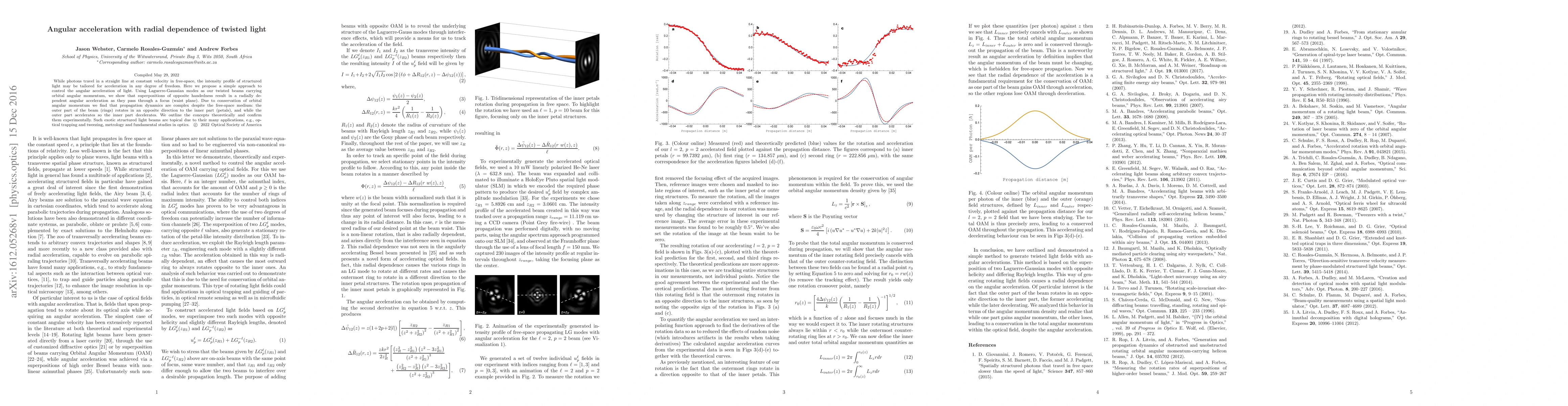 While photons travel in a straight line at constant velocity in free-space, the intensity profile of structured light may be tailored for acceleration in any degree of freedom. Here we propose a simple approach to control the angular acceleration of light. Using Laguerre-Gaussian modes as our twisted beams carrying orbital angular momentum, we show that superpositions of opposite handedness result in a radially dependent angular acceleration as they pass through a focus (waist plane). Due to conservation of orbital angular momentum we find that propagation dynamics are complex despite the free-space medium: the outer part of the beam (rings) rotates in an opposite direction to the inner part (petals), and while the outer part accelerates so the inner part decelerates. We outline the concepts theoretically and confirm them experimentally. Such exotic structured light beams are topical due to their many applications, e.g., optical trapping and tweezing, metrology and fundamental studies in optics.