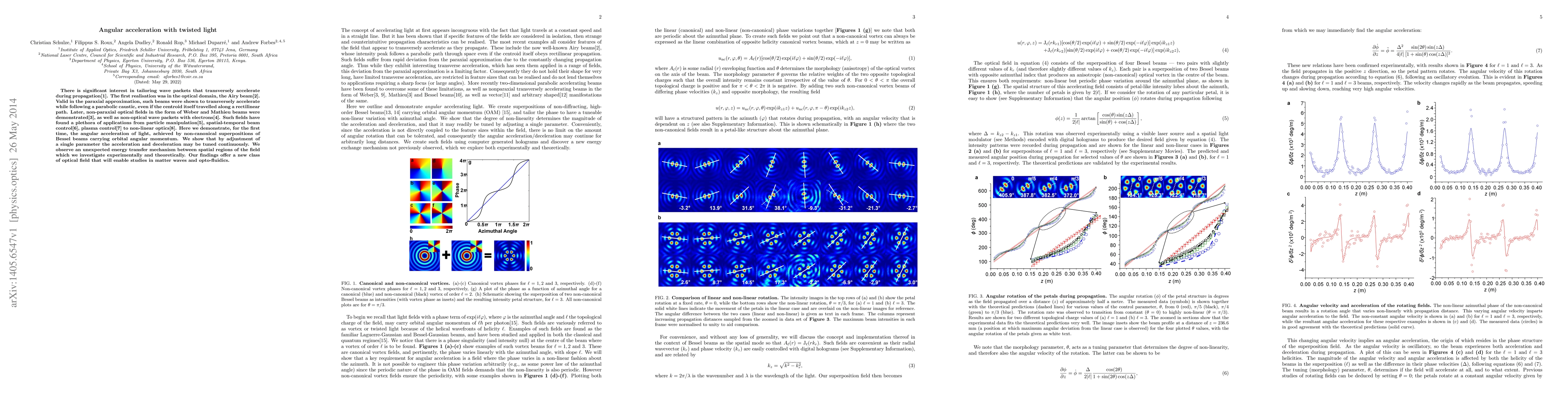 There is significant interest in tailoring wave packets that transversely accelerate during propagation. The first realisation was in the optical domain, the Airy beam. Valid in the paraxial approximation, such beams were shown to transversely accelerate while following a parabolic caustic, even if the centroid itself travelled along a rectilinear path. Later, non-paraxial optical fields in the form of Weber and Mathieu beams were demonstrated, as well as non-optical wave packets with electrons. Such fields have found a plethora of applications from particle manipulation, spatial-temporal beam control, plasma control to non-linear optics. Here we demonstrate, for the first time, the angular acceleration of light, achieved by non-canonical superpositions of Bessel beams carrying orbital angular momentum. We show that by adjustment of a single parameter the acceleration and deceleration may be tuned continuously. We observe an unexpected energy transfer mechanism between spatial regions of the field which we investigate experimentally and theoretically. Our findings offer a new class of optical field that will enable studies in matter waves and opto-fluidics.
