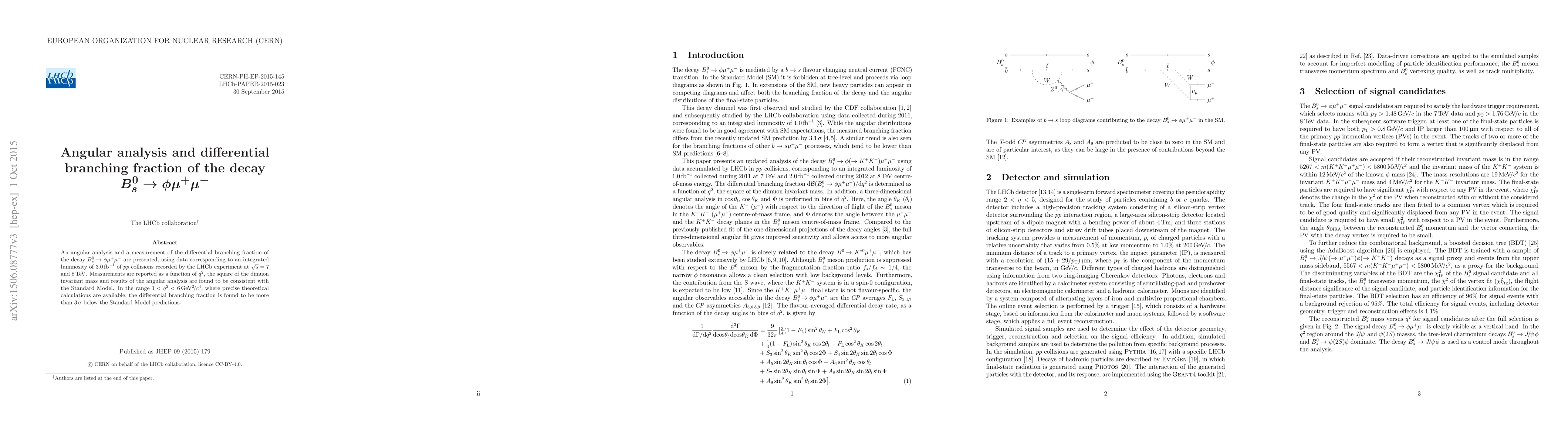 This paper presents an angular analysis and differential branching fraction measurement for the decay $B^0_s\to\phi\mu^+\mu^-$ using LHCb data from $pp$ collisions at $7$ and $8\, {\rm TeV}$. Results are consistent with the Standard Model, but show a $3\,\sigma$ discrepancy in the differential branching fraction below predictions in the $1<q^2<6\, {\rm GeV}^{2}/c^{4}$ range.