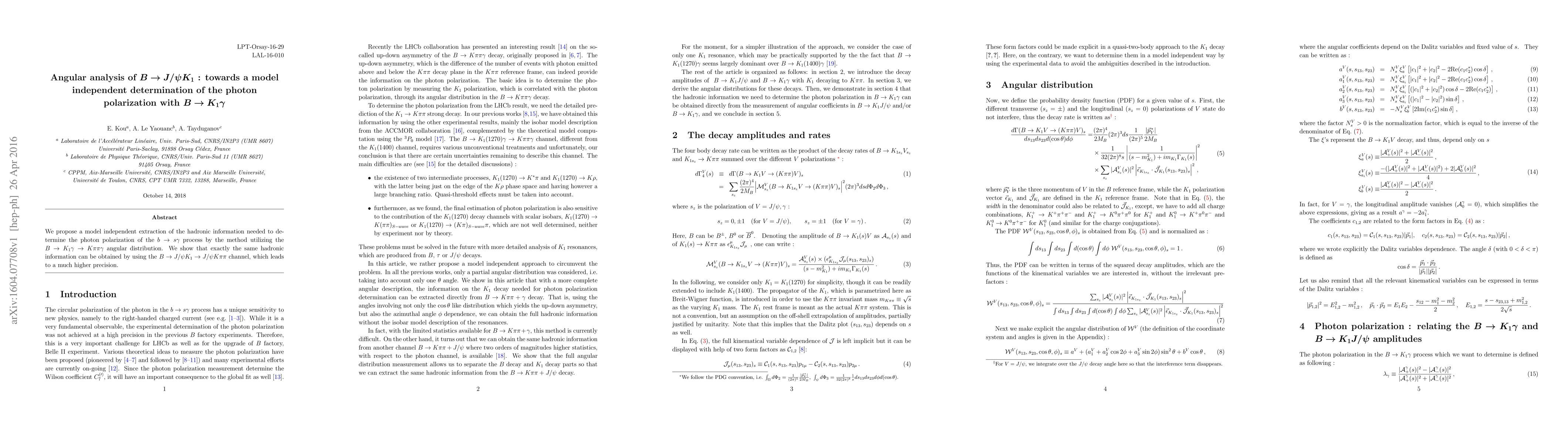 We propose a model independent extraction of the hadronic information needed to determine the photon polarization of the b-> s gamma process by the method utilizing the B -> K1 gamma -> K pi pi gamma angular distribution. We show that exactly the same hadronic information can be obtained by using the B -> J/psi K1 -> J/psi K pi pi channel, which leads to a much higher precision.