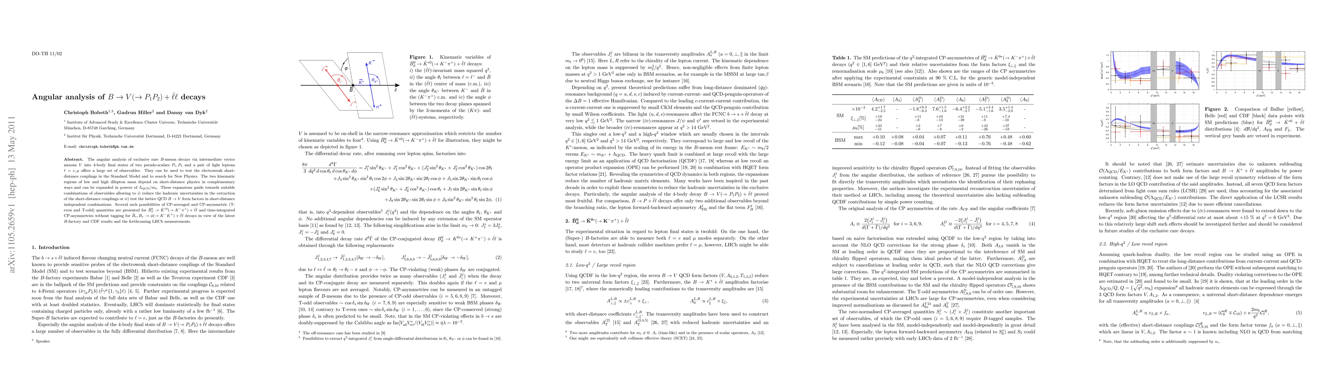 This paper conducts an angular analysis of rare B-meson decays into four-body final states, aiming to test the Standard Model's electroweak couplings and search for New Physics. It explores complementary kinematic regions to reduce hadronic uncertainties and validate lattice QCD predictions.