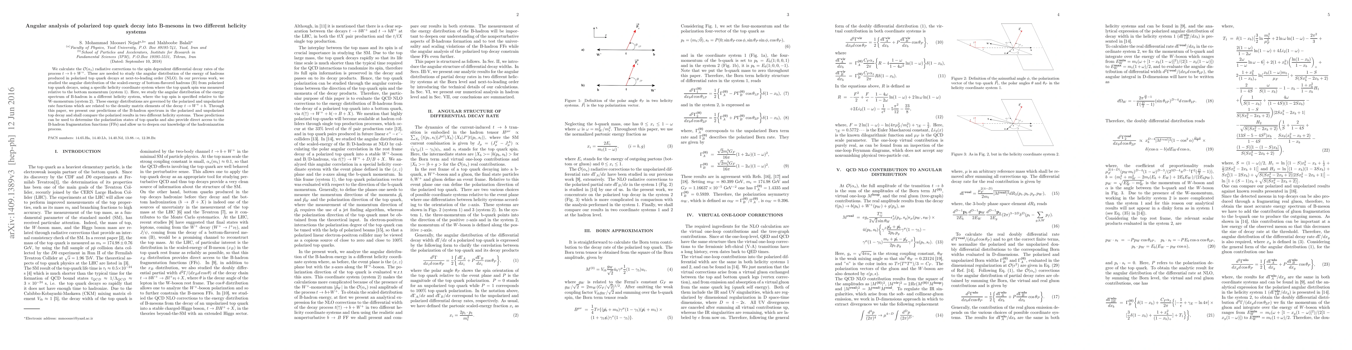 This paper calculates ${\cal O}(\alpha_s)$ radiative corrections for the angular distribution of B-mesons from polarized top quark decays at next-to-leading order, comparing two different helicity systems: one where the top spin is relative to the bottom momentum, and another where it is relative to the W-momentum. The results provide insights into top quark polarization states and B-hadron fragmentation functions.