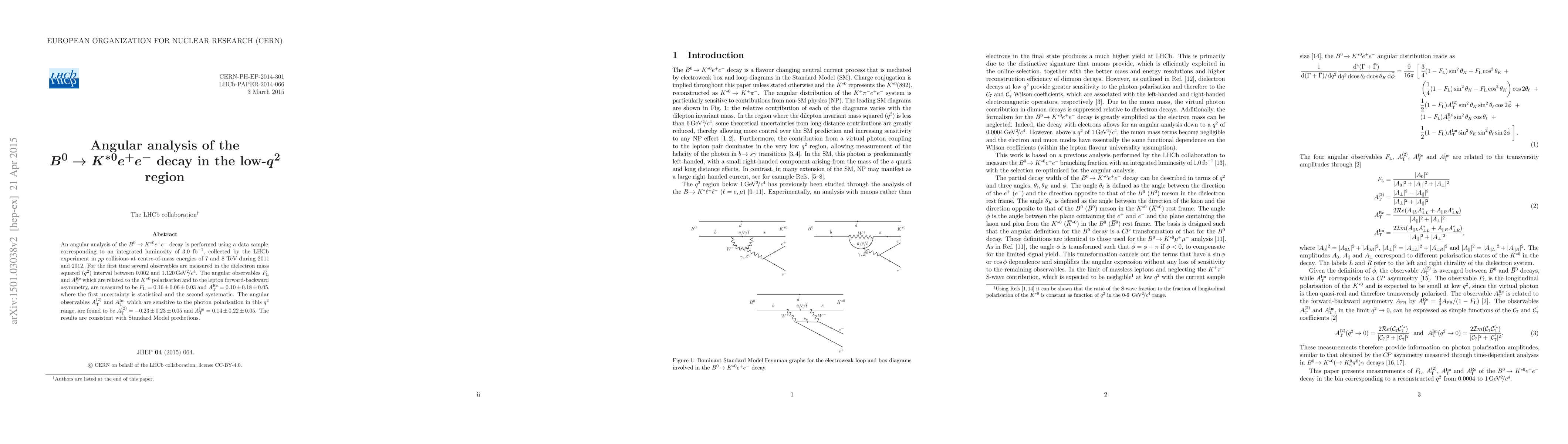 This paper presents an angular analysis of the $B^0 \rightarrow K^{*0} e^+ e^-$ decay in the low-$q^2$ region, measuring several observables for the first time. The results are consistent with Standard Model predictions, with key observables $F_{\mathrm{L}}$ and $A_{\mathrm{T}}^{\mathrm{Re}}$ showing no significant deviations.