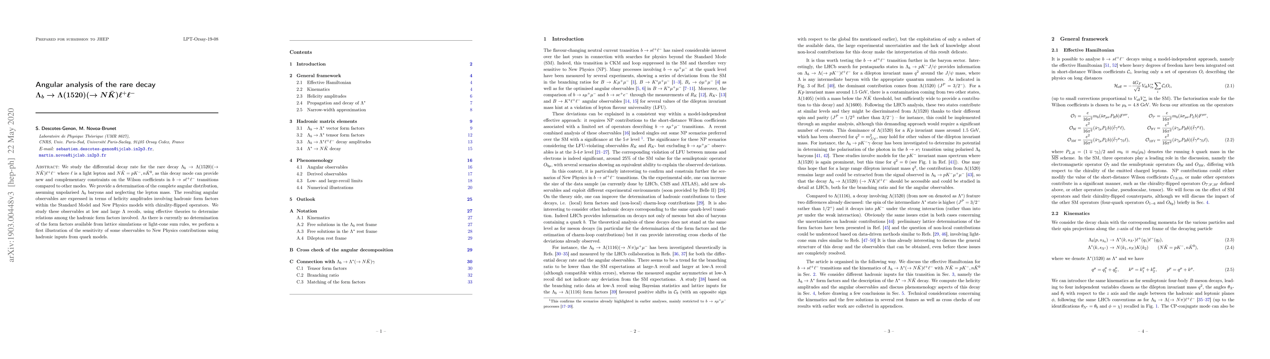 We study the differential decay rate for the rare decay $\Lambda_b\to \Lambda(1520)(\to NK)\ell^+\ell^-$ where $\ell$ is a light lepton, as this decay mode can provide new and complementary constraints on the Wilson coefficients in $b\to s\ell^+\ell^-$ transitions compared to other modes. We provide a determination of the complete angular distribution, assuming unpolarised $\Lambda_b$ baryons and neglecting the lepton mass. The resulting angular observables are expressed in terms of helicity amplitudes involving hadronic form factors within the Standard Model and New physics models with chirality-flipped operators. We study these observables at low and large $\Lambda$ recoils, using effective theories to determine relations among the hadronic form factors involved. As there is currently no determination of the form factors available from lattice simulations or light-cone sum rules, we perform a first illustration of the sensitivity of some observables to New Physics contributions using hadronic inputs from quark models.
