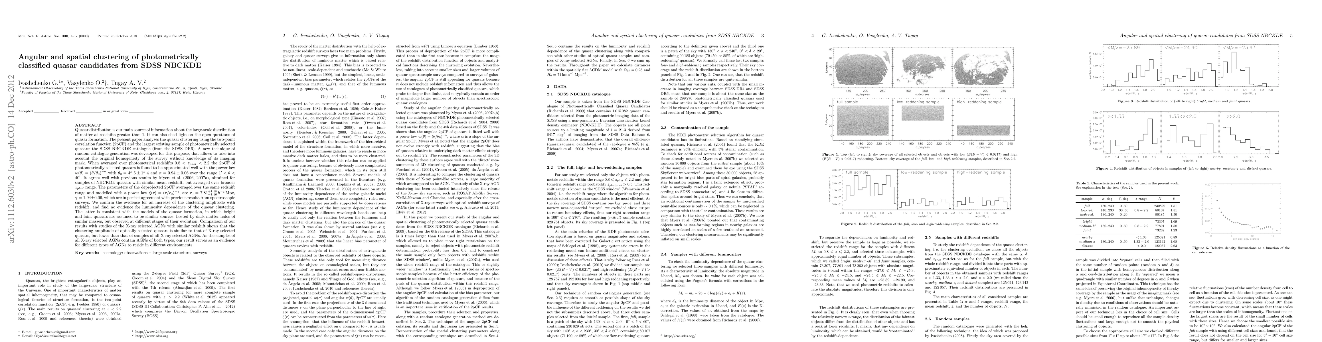 This paper investigates the angular and spatial clustering of quasar candidates from the SDSS NBCKDE catalogue using the two-point correlation function. It finds that the quasar clustering follows a power law, consistent with previous spectroscopic survey results, and shows no luminosity dependence, supporting models where bright and faint quasars originate from similar environments.