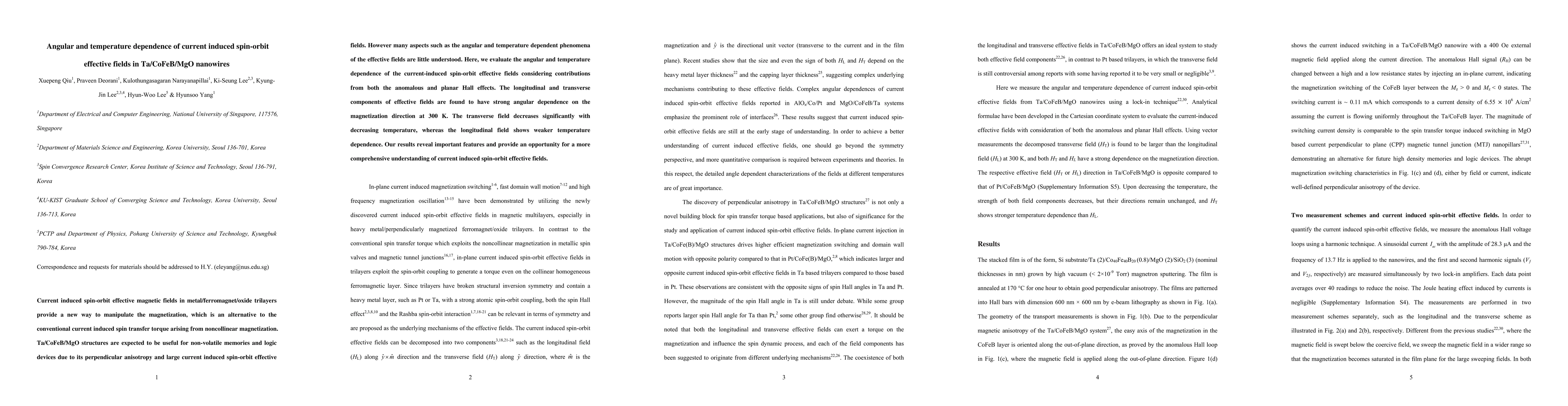This paper investigates the angular and temperature dependence of current-induced spin-orbit effective fields in Ta/CoFeB/MgO nanowires, revealing strong angular effects on both longitudinal and transverse components at 300 K, with a notable decrease in the transverse field at lower temperatures. These findings enhance the understanding of magnetization manipulation in advanced memory and logic devices.