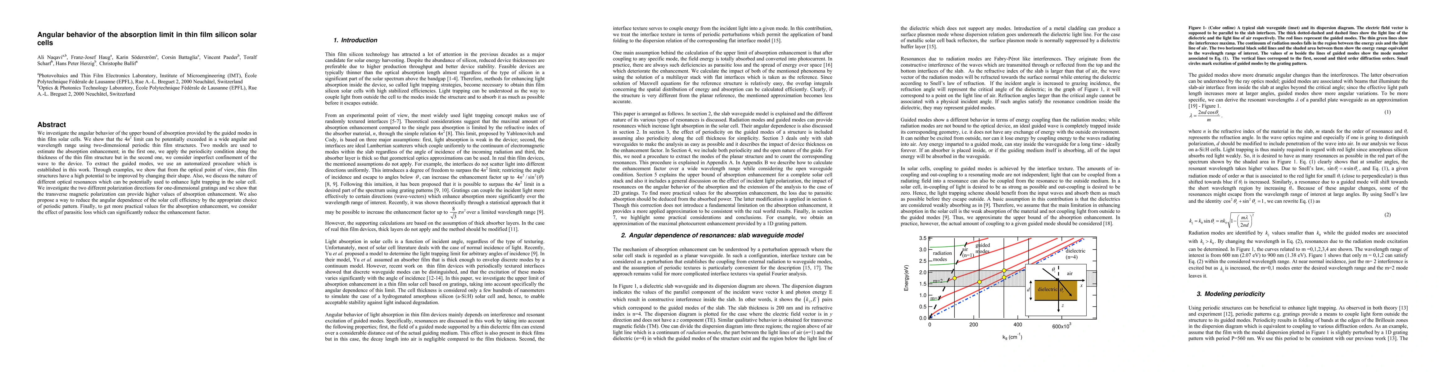 This paper investigates the angular behavior of absorption limits in thin film silicon solar cells, demonstrating that the traditional 4n^2 limit can be exceeded using two-dimensional periodic structures. The study proposes methods to enhance absorption and reduce angular dependence, highlighting the potential for improved solar cell efficiency through optimized design.