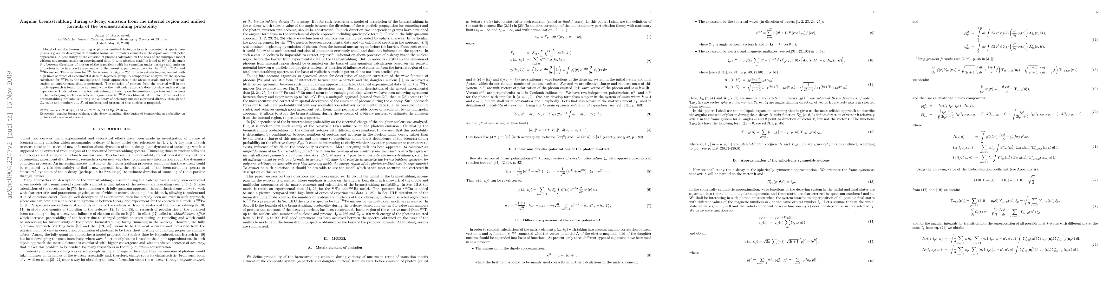 Model of angular bremsstrahlung of photons emitted during $\alpha$-decay is presented. A special emphasis is given on development of unified formalism of matrix elements in the dipole and multipolar approaches. A probability of the emission of photons calculated on the basis of the multipole model without any normalization on experimental data (i. e. in absolute scale) is found at $90^{\circ}$ of the angle $\vartheta_{\alpha\gamma}$ between directions of motion of the $\alpha$-particle (with its tunneling under barrier) and emission of photons to be in a good agreement with the newest experimental data for the $^{210}{\rm Po}$, $^{214}{\rm Po}$, and $^{226}{\rm Ra}$ nuclei. The spectrum for $^{244}{\rm Cm}$ is found at $\vartheta_{\alpha\gamma} = 25^{\circ}$ to be in satisfactory agreement with high limit of errors of experimental data of Japanese group. A comparative analysis for the spectra calculated for $^{210}{\rm Po}$ by the multipole and dipole approaches in the absolute scale and with normalization on experimental data is performed. The emission of photons from the internal well in the dipole approach is found to be not small while the multipolar approach does not show such a strong dependence. Distribution of the bremsstrahlung probability on the numbers of protons and nucleons of the $\alpha$-decaying nucleus in selected region close to $^{210}{\rm Po}$ is obtained. An unified formula of the bremsstrahlung probability during the $\alpha$-decay of arbitrary nucleus expressed directly through the $Q_{\alpha}$-value and numbers $A_{p}$, $Z_{p}$ of nucleons and protons of this nucleus is proposed.
