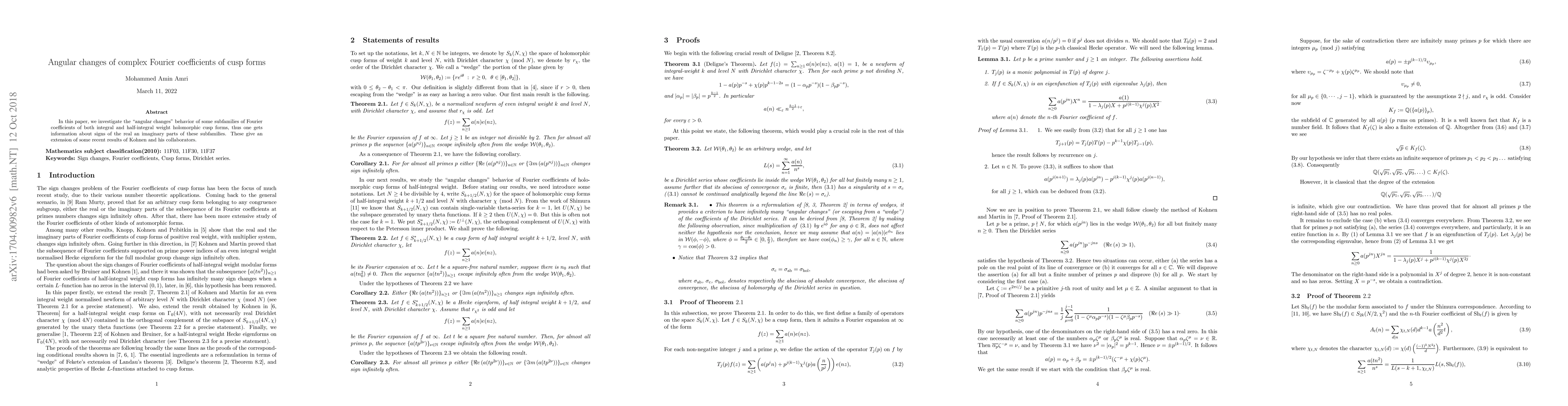 Summary: This paper explores the angular behavior of Fourier coefficients of cusp forms, extending recent findings on the signs of their real and imaginary parts. The study focuses on both integral and half-integral weight holomorphic cusp forms.