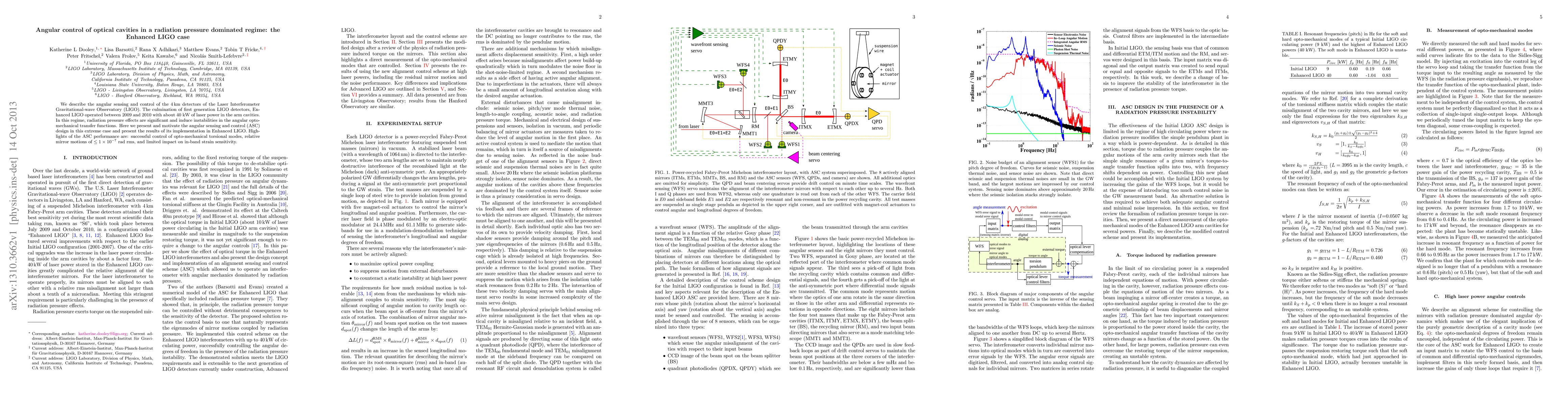 This paper details the angular sensing and control (ASC) design for Enhanced LIGO's 4 km detectors, addressing significant radiation pressure-induced instabilities. The ASC successfully controlled opto-mechanical torsional modes and achieved relative mirror motions of 1x10^{-7} rad rms with minimal impact on in-band strain sensitivity.