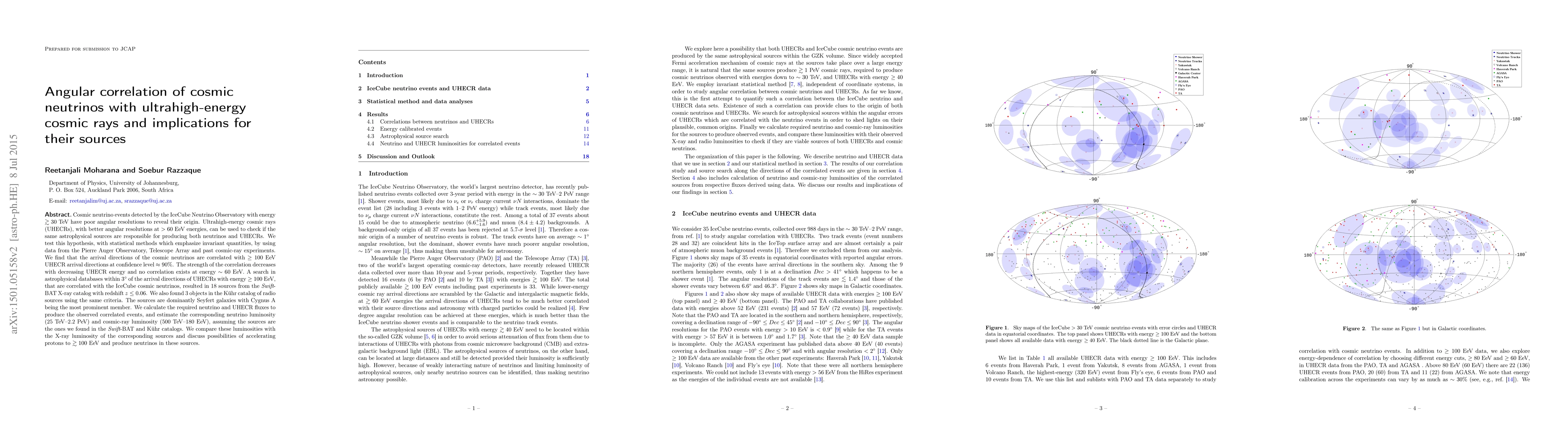 This research investigates the angular correlation between high-energy cosmic neutrinos and ultrahigh-energy cosmic rays (UHECRs) to identify potential common astrophysical sources. The study finds a significant correlation between neutrinos and UHECRs above 100 EeV, suggesting a shared origin, primarily in Seyfert galaxies like Cygnus A.