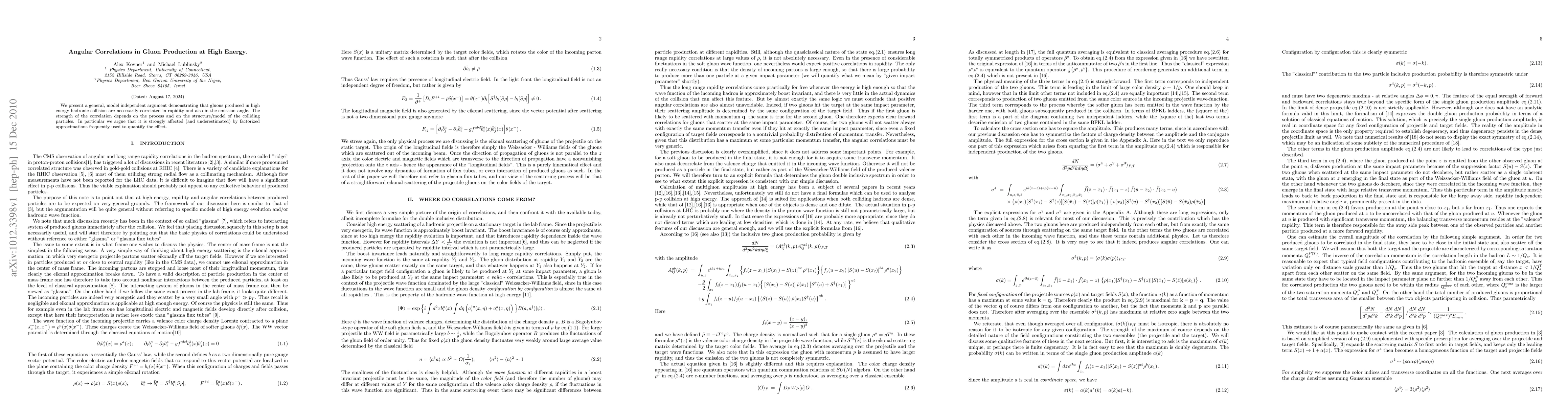 We present a general, model independent argument demonstrating that gluons produced in high energy hadronic collision are necessarily correlated in rapidity and also in the emission angle. The strength of the correlation depends on the process and on the structure/model of the colliding particles. In particular we argue that it is strongly affected (and underestimated) by factorized approximations frequently used to quantify the effect.